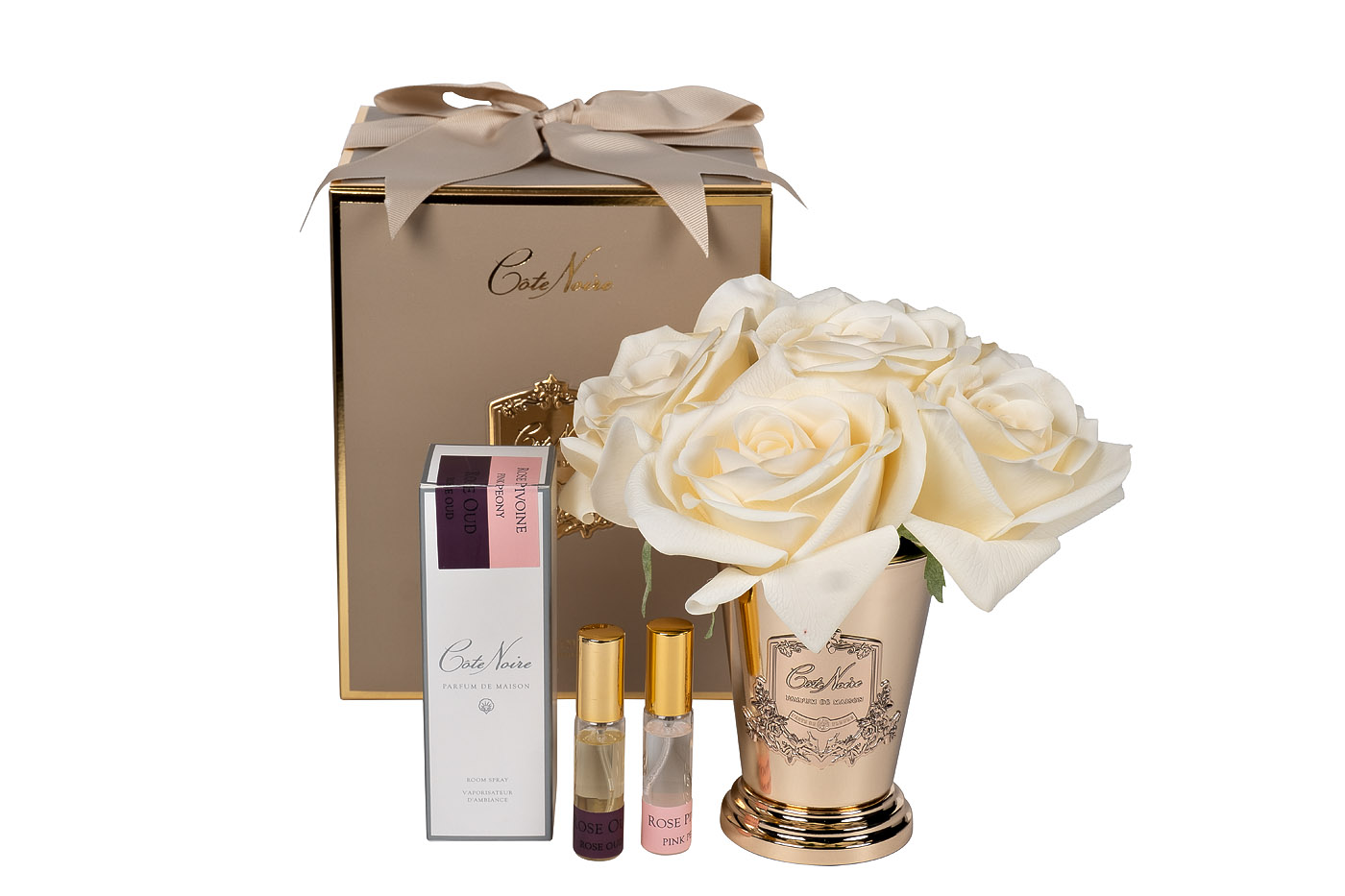 Восхитительные французские ароматы для дома в стиле ар-деко: набор из семи белых искусственных роз в золотистой вазе-стакане, и набора парфюмерных спреев Rose Oud и Pink Peonies.