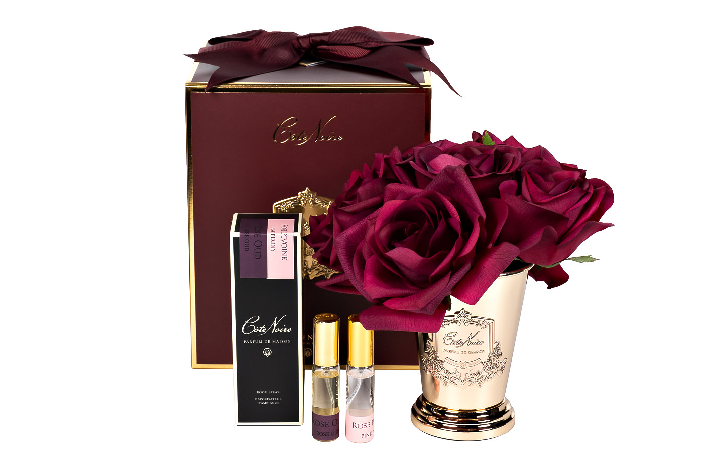 Восхитительные французские ароматы для дома в стиле ар-деко: набор из семи искусственных роз роскошного бордового цвета в золотистой вазе-стакане, и набора парфюмерных спреев Rose Oud и Pink Peonies.