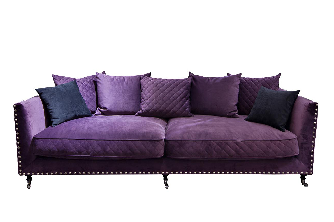Элегантный диван с обивкой из фиолетового микровелюра для сибаритов и аристократов. Подушки сидений из латексоподобного высокоэластичного полиуретана и натуральной гусиной пухо-перьевой смеси с латексными чипсами обеспечивают максимальный комфорт и держат форму. Двухцветные велюровые подушки спинки также имеют набивку из натурального гусиного пухо-перьевого наполнителя с инновационным наполнителем Микромакс, максимально мягко и комфортабельно обеспечивающим стабильную поддержку тела. Каркас дивана выполнен из калиброванного деревянного бруса 1 категории; в основании дивана - высококачественная фанера из натуральной березы и эластичные ремни. Отделка декоративными гвоздиками в трех цветах на выбор. В состав микровелюра входит нейлон (5%) для значительного увеличения износостойкости.
