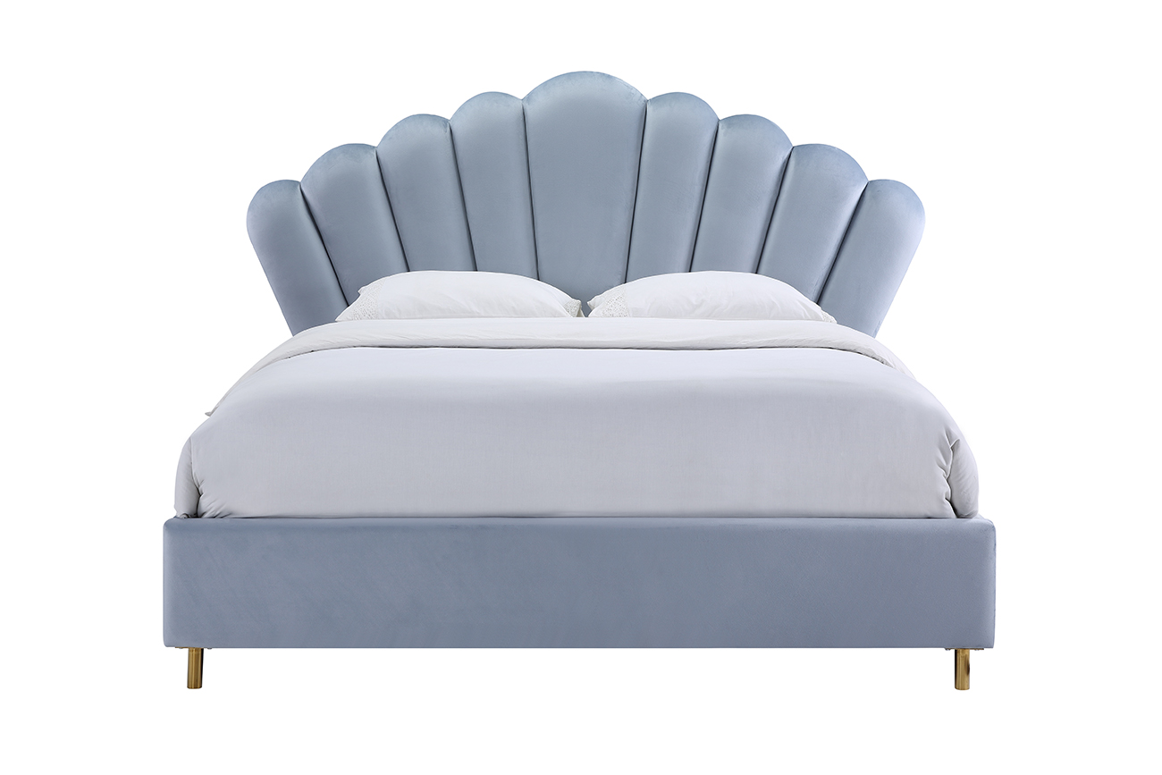 Элегантная двуспальная кровать с расширяющимся кверху изголовьем из мягкого велюра. Приятный умиротворяющий серо-голубой оттенок ткани позволит создать приятную атмосферу для отдыха.