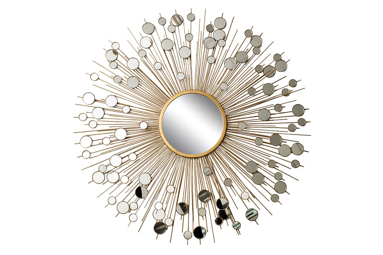 Хит продаж! Оригинальное декоративное зеркало гармонично впишется в современный интерьер спальной или гостиной. Центральное зеркало диаметром 25см окружено множеством золотистых "солнечных" лучей с маленькими зеркальцами. Естественный или искусственный свет, падающий на зеркальные поверхности, преобразуется в целую россыпь искрящихся бликов и солнечных зайчиков, создающих в комнате легкое весеннее настроение независимо от времени года или погоды на улице. Это зеркало - чудесный и оригинальный подарок, вместе с которым вы впускаете в дом любовь и счастье!