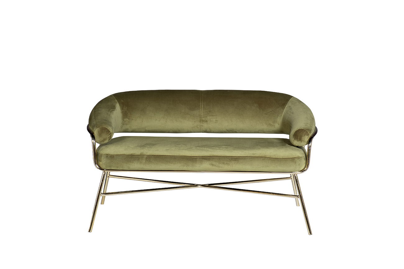Прелестный двухместный диван-скамейка будто создан для уютных затраков или вечерних бесед за бокалом вина. Мягкое сиденье и спинка из велюра приятного оливкового оттенка красиво сочетаются с изящными ножками из полированной стали золотого цвета. Диван подойдет как для небольшой гостиной в стиле ар-деко, так и для кабинета или закрытой терассы.