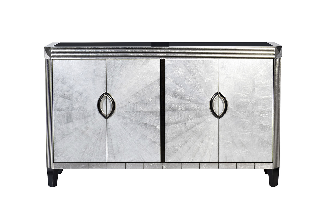 Восхитительный дизайнерский комод "Sole Mio" в стиле ар-деко поражает красотой и необычностью отделки. Распашные дверцы, декорированные в виде солнечных лучей, отделаны тончайшими листьями серебристой фольги и тщательно залакированы вручную по авторской технологии. Поверх корпуса и ножек цвета серебра широкими плотными мазками нанесен черный лак для достижения особого эффекта сияния. Корпус обработан со всех сторон, чтобы размещать комод как у стены, так и в центральной части помещения, и отделан широким рифленым кантом цвета старого серебра. Объемные овальные ручки на дверцах служат центром дизайнерской композиции, открывая доступ в два вместительных отделения с полкой. Внутреннее пространство комода также залакировано вручную темно-красным лаком, напоминающим восточную шкатулку. Столешница дополнена закаленным стеклом, предотвращающим появление царапин.