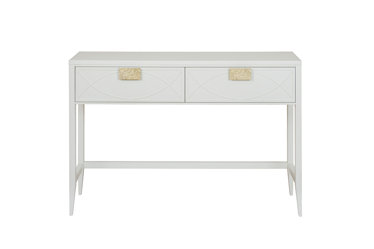 Дизайнерская консоль в стиле ар-деко - авторская разработка студии Garda Decor. Бежевый матовый фасад украшен объемным дугообразным декором и широкими рельефными ручками цвета матовое золото. Два выдвижных ящика прекрасно подойдут для хранения щеток, косметики и прочих мелочей. Тонкие ножки придают конструкции легкость и изящество. Эксклюзивная консоль станет гармоничным дополнением интерьера прихожей, спальни или гостиной. Размер: ширина- 120см, высота- 80см, глубина- 35см.На нашем сайте представлены ТВ-тумба арт.151SV-00004, комод арт.151SV-00006, прикроватная тумба арт. 151SV-00007 из авторской коллекции Garda Decor для изысканной меблировки вашего дома в едином стиле. Цвет изделия может незначительно отличаться от изображений на сайте в зависимости от цветопередачи вашего устройства.