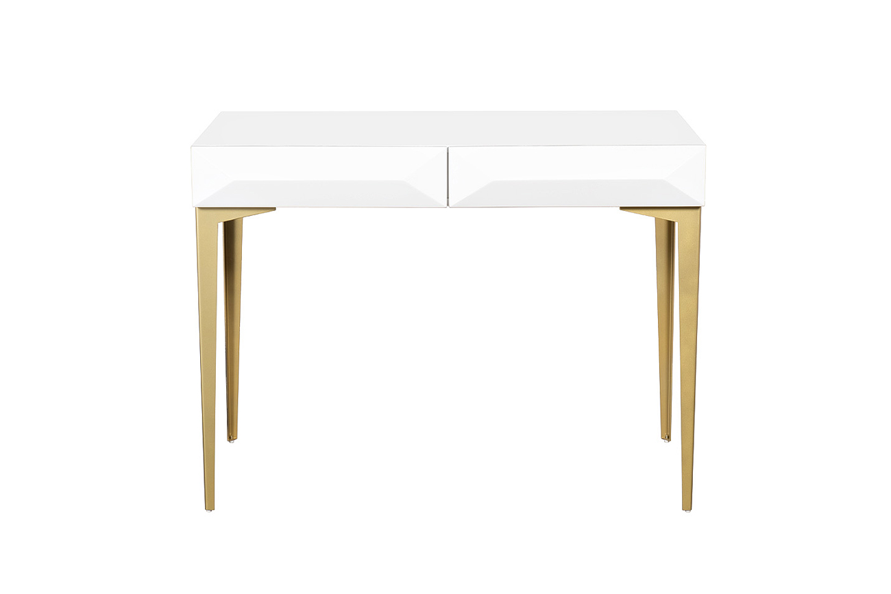 Стильная и современная консоль белого цвета гармонично впишется в светлый интерьер. Функциональную модель можно использовать для оформления спальни, гостиной, кабинета или прихожей. Предмет мебели можно установить в нише, у спинки дивана или сделать будуарным столиком. Изделие имеет два выдвижных ящика, которые можно использовать для хранения документов и подручных мелочей. Модель с длинными металлическими ножками смотрится очень органично и изысканно. Граненый фасад – особенность представленной модели. Оригинальная белая консоль позволит воплотить в жизнь самые смелые интерьерные решения, особенно в сочетании с тумбой 40AD-CB251 и комодом 40AD-CB253 из этой же серии.