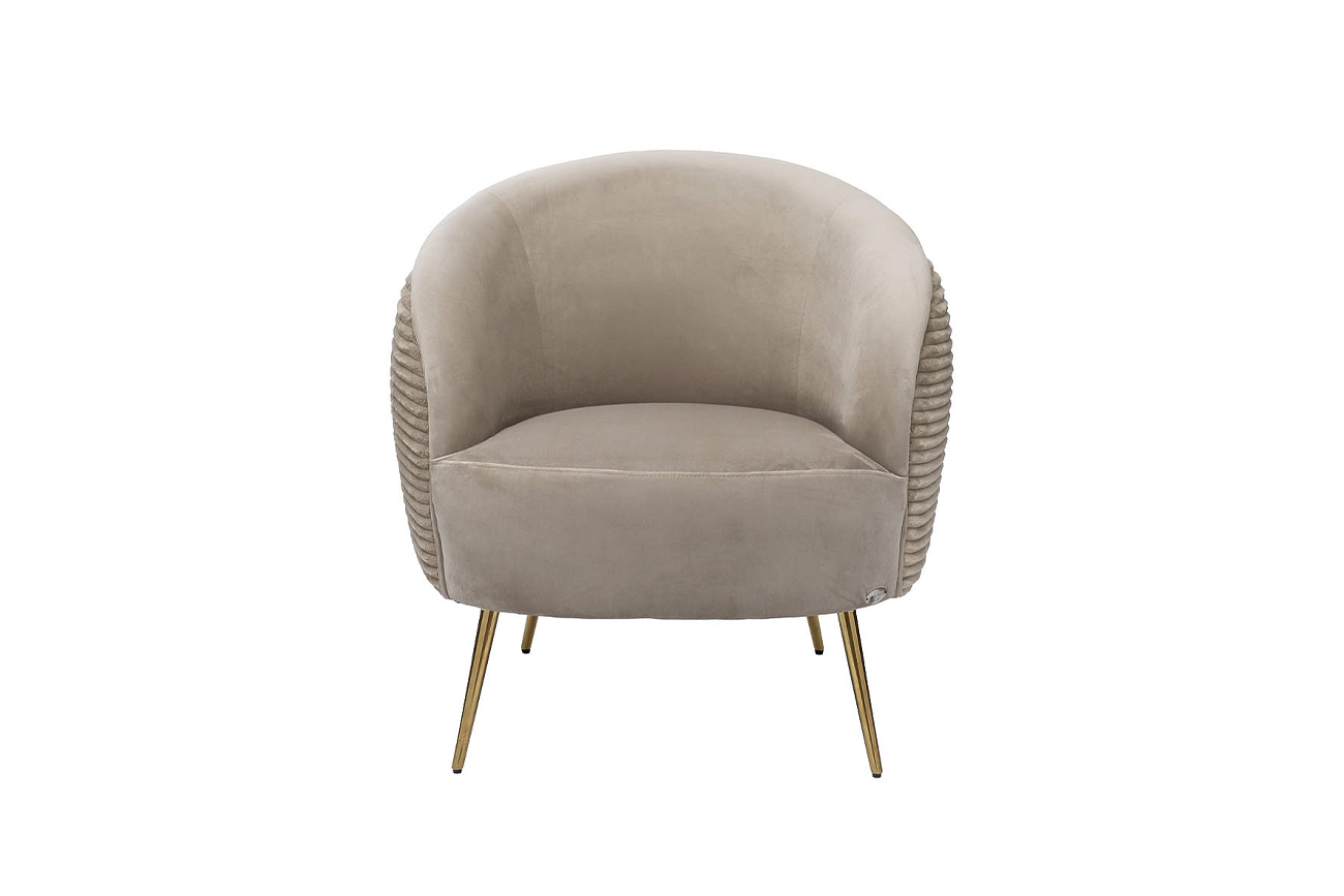 Комфортное велюровое кресло создано в духе последних веяний интерьерной моды. Пухлые, словно поддутые, сиденье и спинка прострочены снаружи. Изящно расставленные золотые ножки в стиле 50-х, прекрасный велюр бежевого цвета и округлые линии придают креслу томный, богемный и влекущий вид.