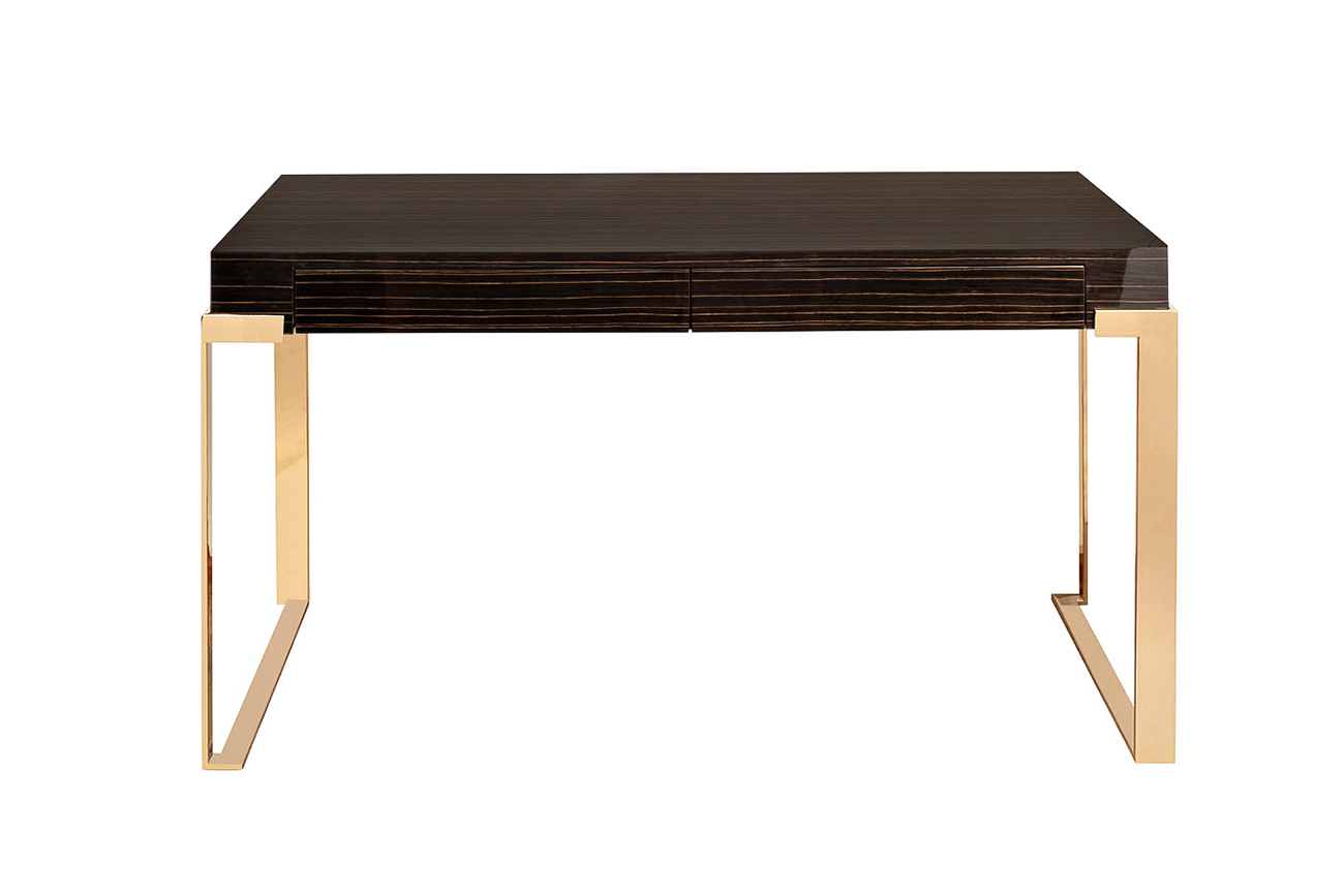 Изящный письменный стол в стиле ар-деко из коллекции Golden Prism покоряет изысканной геометрией форм и роскошью отделки. Тщательно подобранный шпон драгоценного эбенового дерева с золотистыми прожилками создает изысканный рисунок. Столешница и боковые поверхности покрыты в несколько слоев глянцевым лаком; с двух сторон стол обрамляет опора из полированной нержавеюшей стали цвета шампанского. В передней части расположены два небольших выдвижных ящика для бумаг и письменных принадлежностей. Все углы и металлические части стола тщательно обработаны и слегка скруглены. Письменный стол прекрасно впишется в изысканный кабинет или библиотеку.