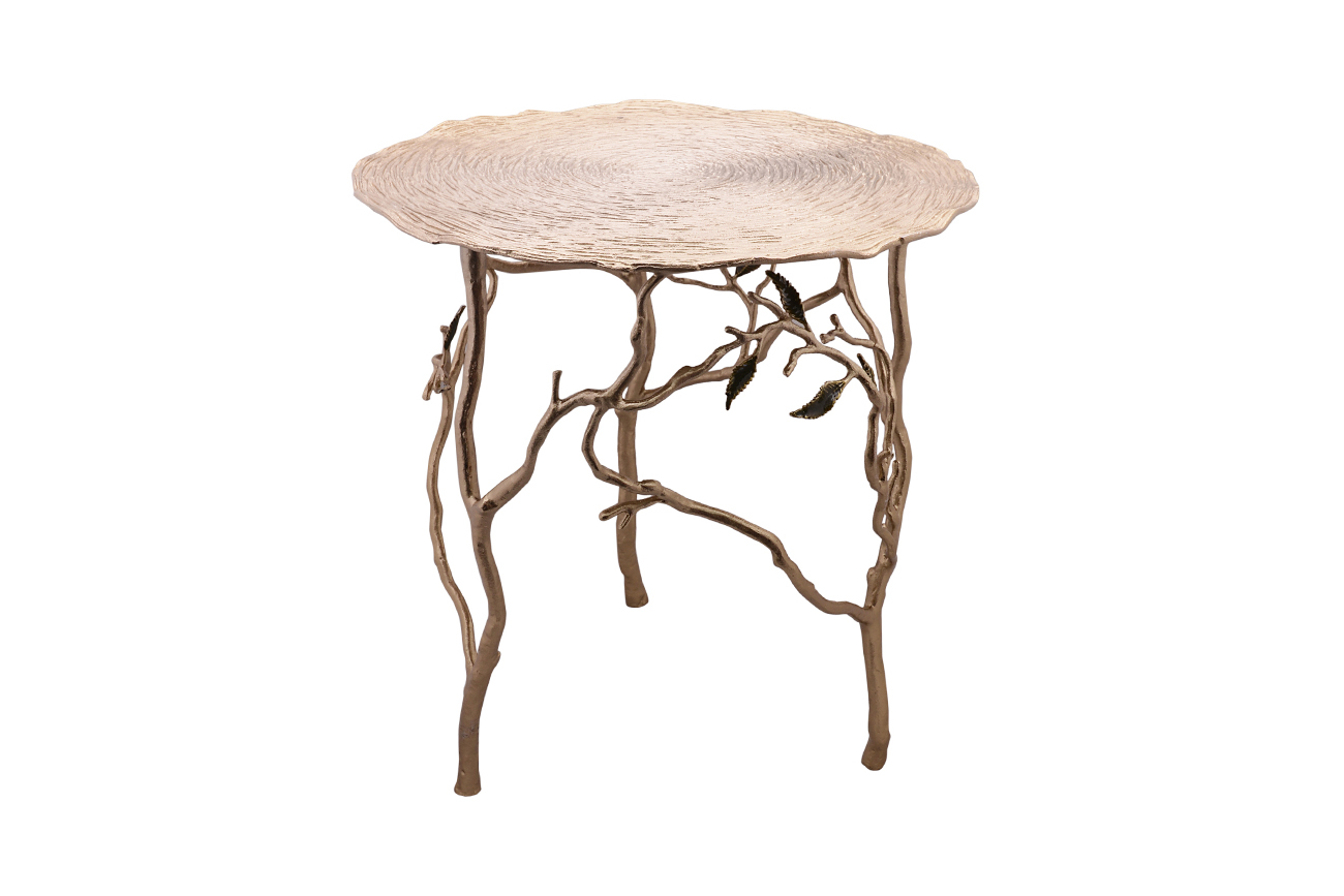 Изысканный дизайнерский столик "Флора" пленяет красотой и оригинальностью исполнения. Металлическая столешница ручной ковки имитирует спил дерева. Ножки в виде веточек украшены искусно выполненными листьями, покрытыми эмалью. Все детали тщательно зашлифованы и отполированы. Этот столик - настоящее произведение искусства, которое сделает вашу гостиную или спальную комнату необыкновенно привлекательной и волшебной.
