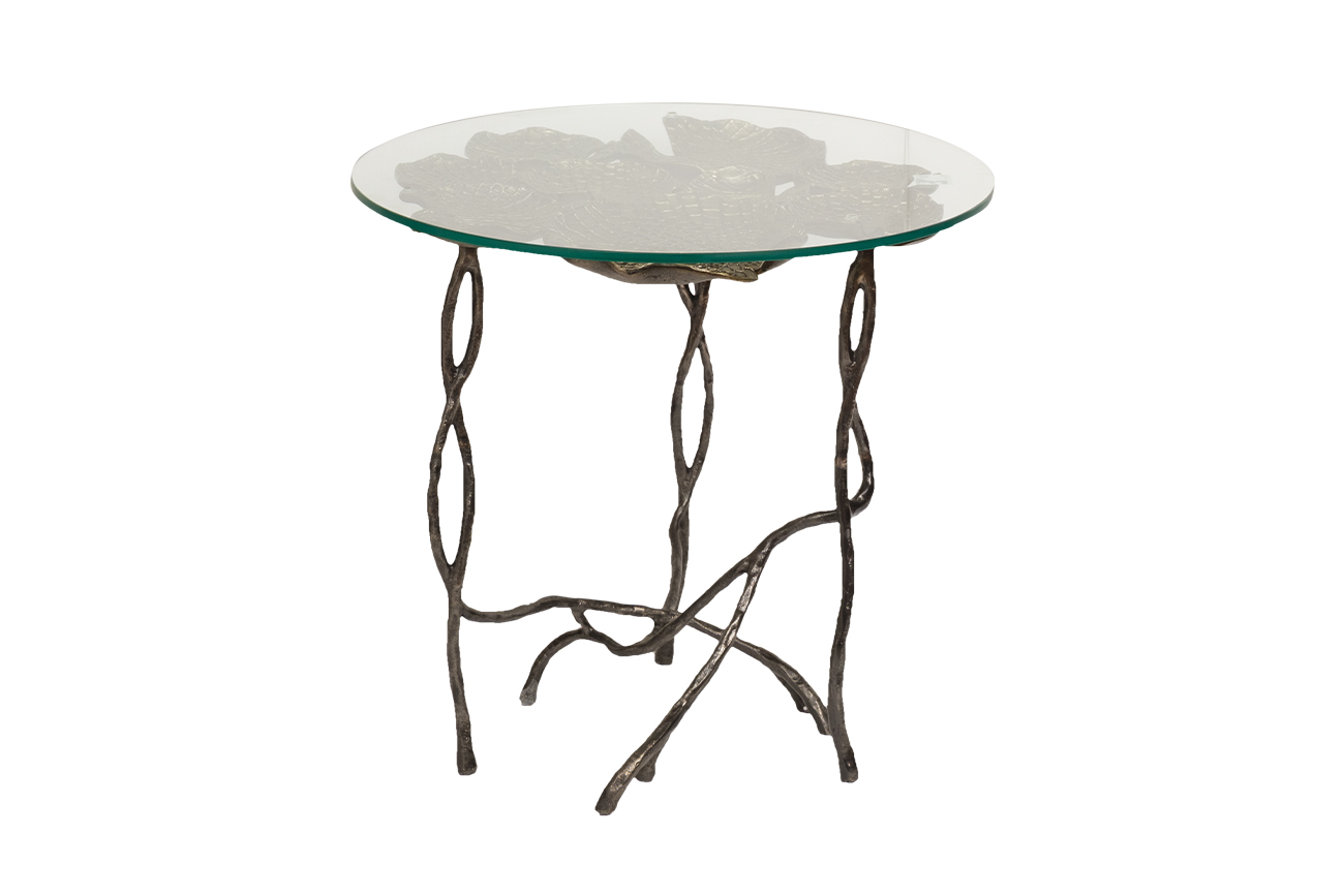 Дивный журнальный стол из кованого металла и стекла изображает листья лотоса на пруду. Столешница из прозрачного закаленного стекла служит водной гладью, а сплетающиеся гибкие стебли - опорой стола. Изысканное дизайнерское творение украсит интерьер в стиль ар-деко или модерн, сделает обстановку живой и артистичной.