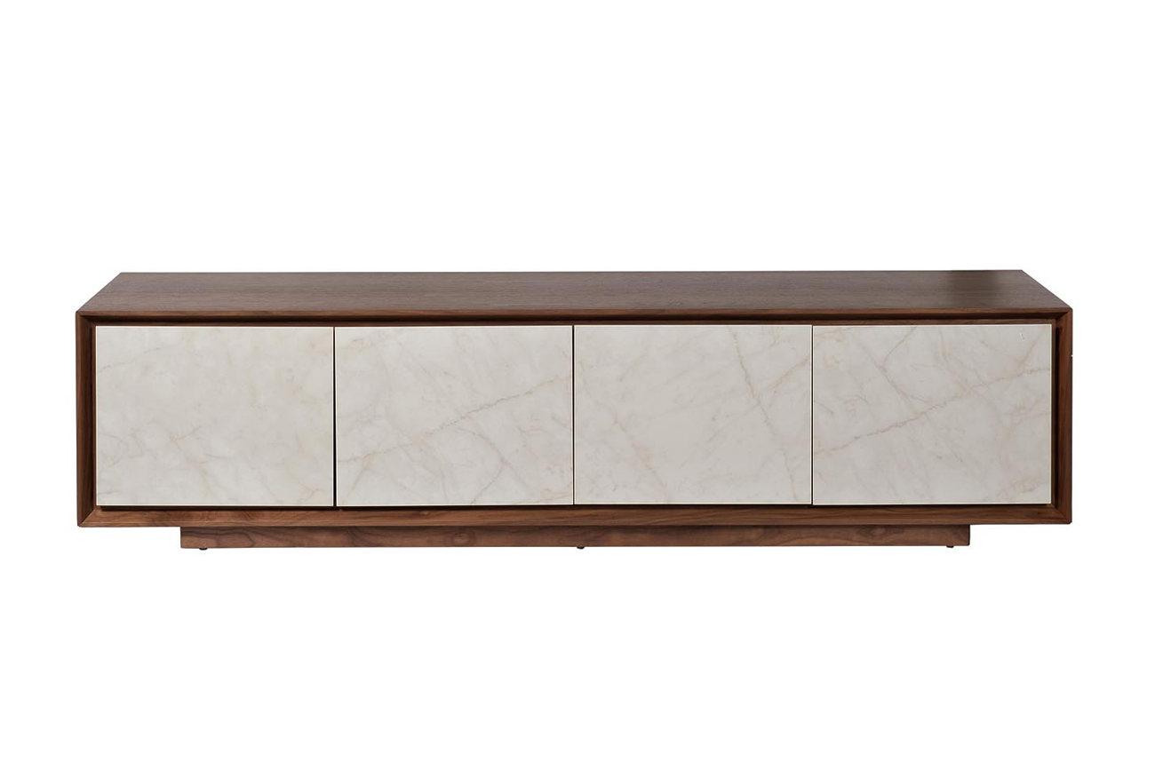 Тумба под телевизор в современном стиле с керамическим фасадом под стать роскошной мраморной мебели, при этом решение максимально практичное. Она длинная, большая, внутренние пространства для хранения закрыты открывающимися дверцами. Отличным решением станет такая тумба под телевизор для гостиной или просторного зала. Может использоваться в сочетании со мебельным гарнитуром либо самостоятельно. Ширина шпонированного корпуса составляет 2 метра. Стиль тумбы под телевизор – неоклассика, поэтому устанавливать мебель можно в различных современных интерьерах.