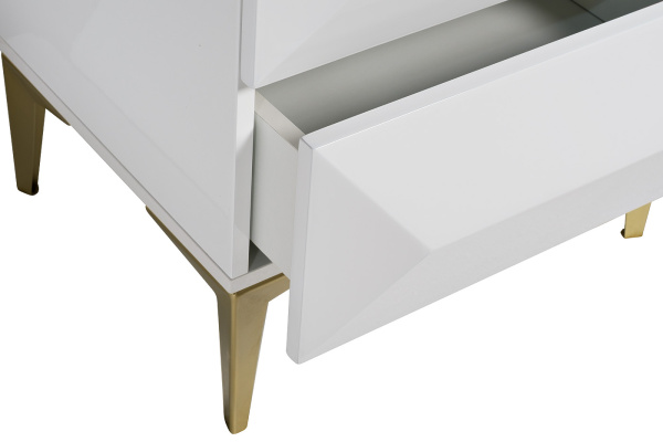 Стильная и современная тумбочка белого цвета гармонично впишется в светлый интерьер. Функциональную модель можно использовать для оформления спальни, гостиной, кабинета или прихожей. Предмет мебели можно установить в нише, у кровати или возле дивана. Изделие имеет два выдвижных ящика, которые можно использовать для хранения документов и подручных мелочей. Модель с металлическими ножками смотрится очень органично и изысканно. Граненый фасад – особенность представленной модели. Оригинальная белая тумбочка позволит воплотить в жизнь самые смелые интерьерные решения, особенно в сочетании с консолью 40AD-DT095 и комодом 40AD-CB253 из этой же серии.