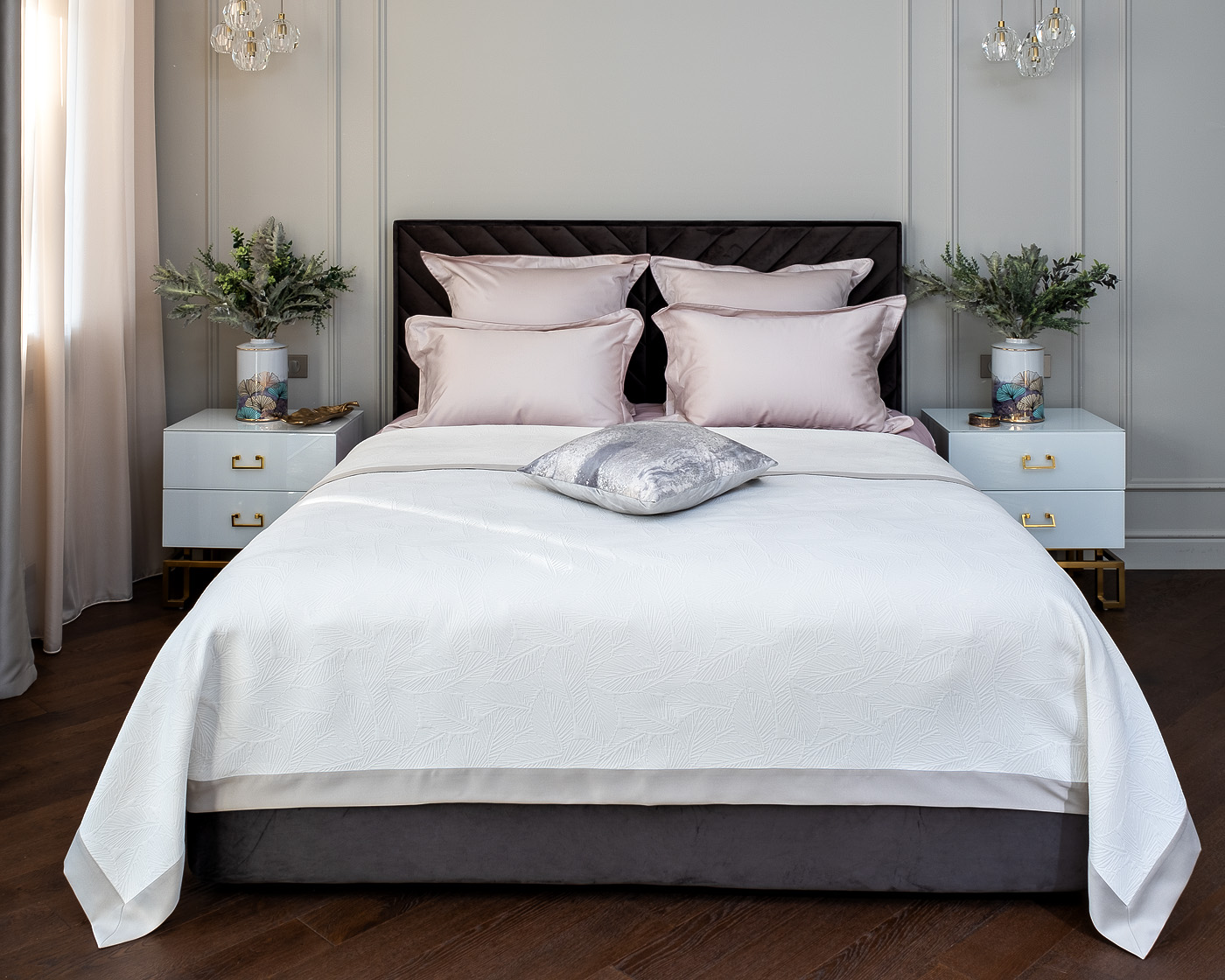 Растительные орнаменты в интерьере — это узор с повторяющимися элементами, чередование которых привносят в интерьер столько уюта, что не хочется покидать его долгое время. Покрывало Сан-Ремо изготовлено в технике жаккард с современным дизайном в виде стилизованных листьев, обрамленное кантом из димаута. Такое покрывало, помещенное на кровать или диван, кардинально меняет вид даже самой обычной комнаты. Сюда привносятся аристократичные, роскошные нотки, интерьер становится изысканным.
