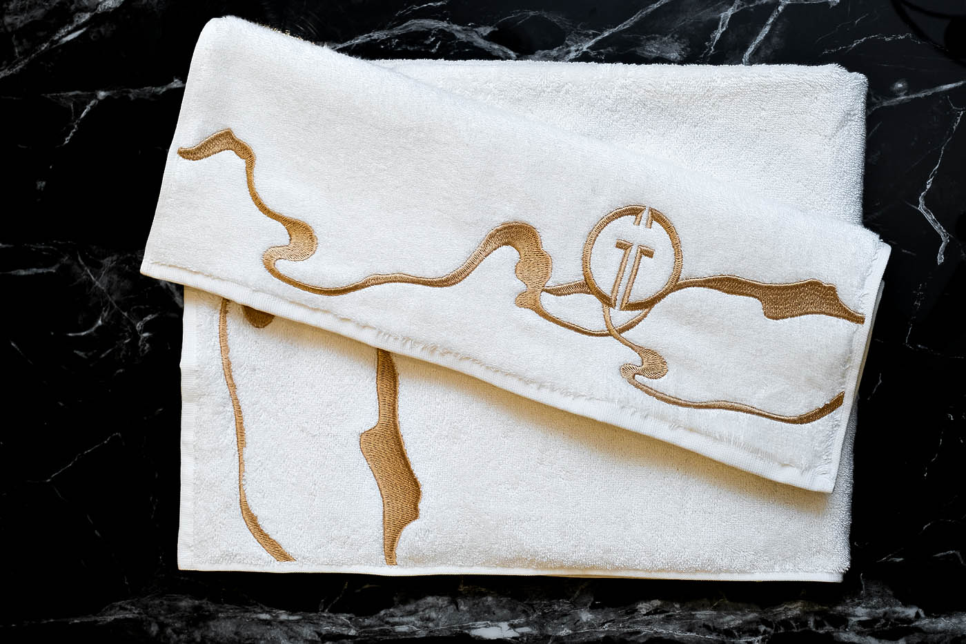 Белое полотенце «Мелодия» представлено в двух размерах: полотенце для рук 50*90см, а также банное полотенце 70х140 см.