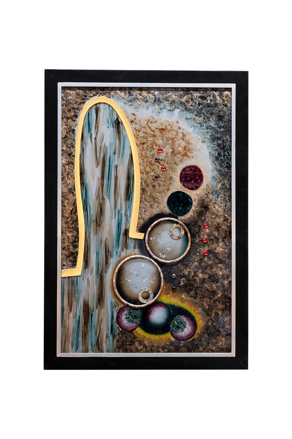 Дизайнерское панно в абстрактном стиле выполнено в уникальной технике ручной росписи по текстурированному стеклу и декорировано объемными элементами из металла.