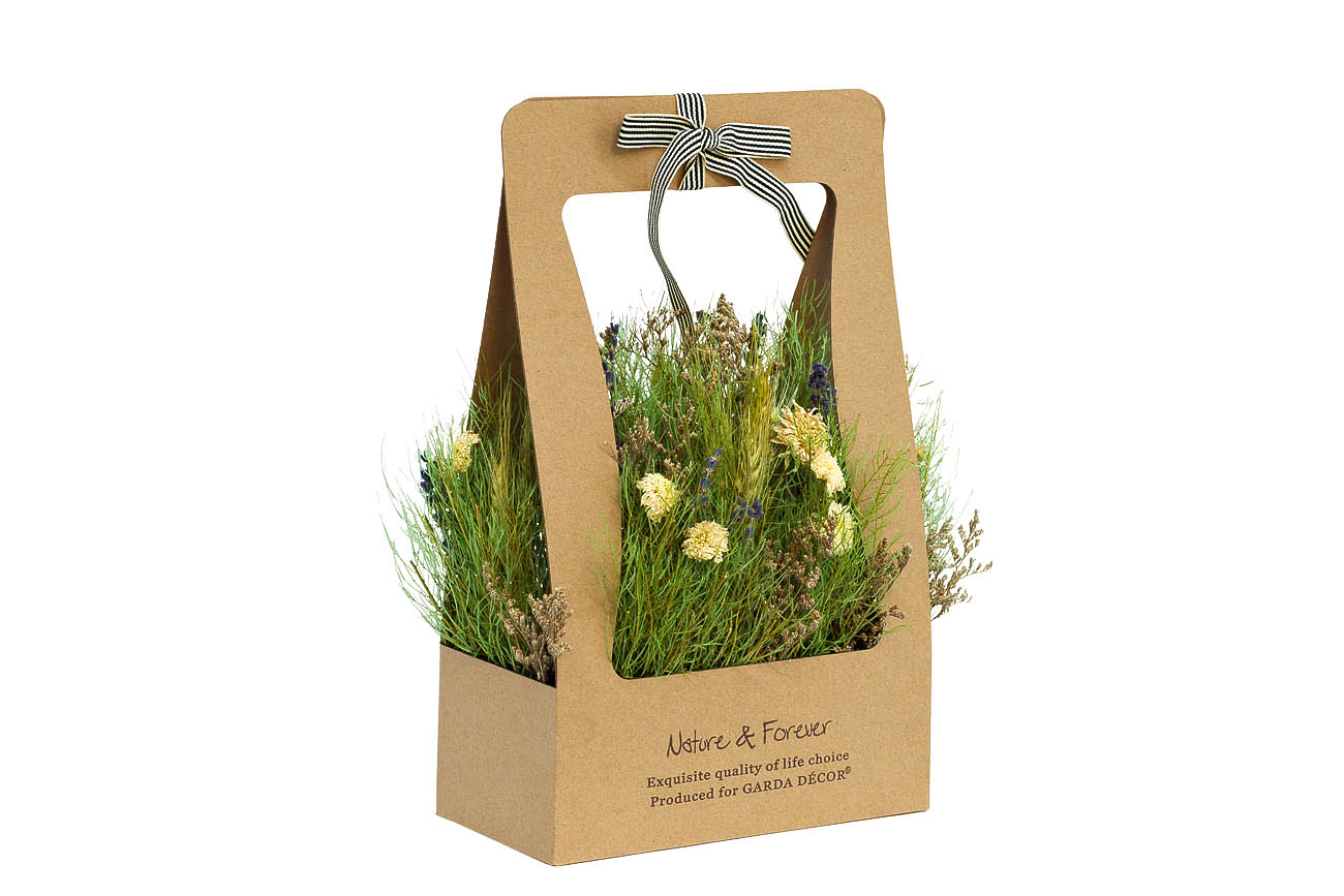 Изысканная композиция в прованском стиле из стабилизированных полевых цветов, злаков и желтых гвоздик в подарочной упаковке из крафтового картона станет приятным подарком или сохранит воспоминания о лете в вашем доме.