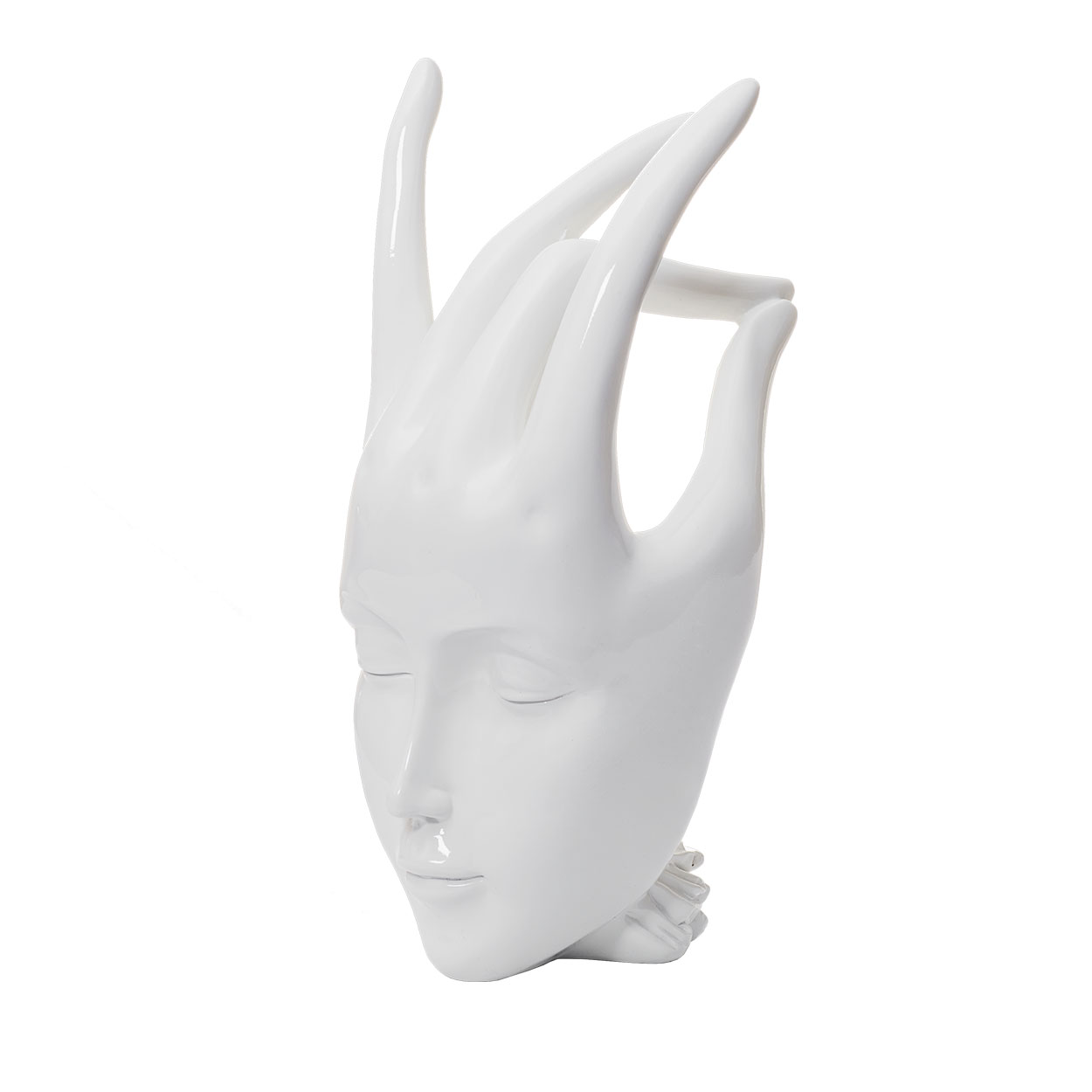 Абстрактная статуэтка-маска "Мудрость" выполнена в виде изящной женской головки, переходящей в кисть руки, пальцы которой сложены в мудру "шуни". Мудры - это священные жесты, способные привести к различным состояниям сознания; их можно найти в древних традициях всего мира: в индуистской, буддистской, христианской. Шуни-мудра переводится с санскрита как «печать терпения». Соединение большого и среднего пальцев символизирует и стимулирует терпение, понимание и дисциплину. Во время медитации шуни-мудра помогает обрести силу, стойкость и решительность для выполнения своих обязанностей, превращает негативные эмоции в позитивные.