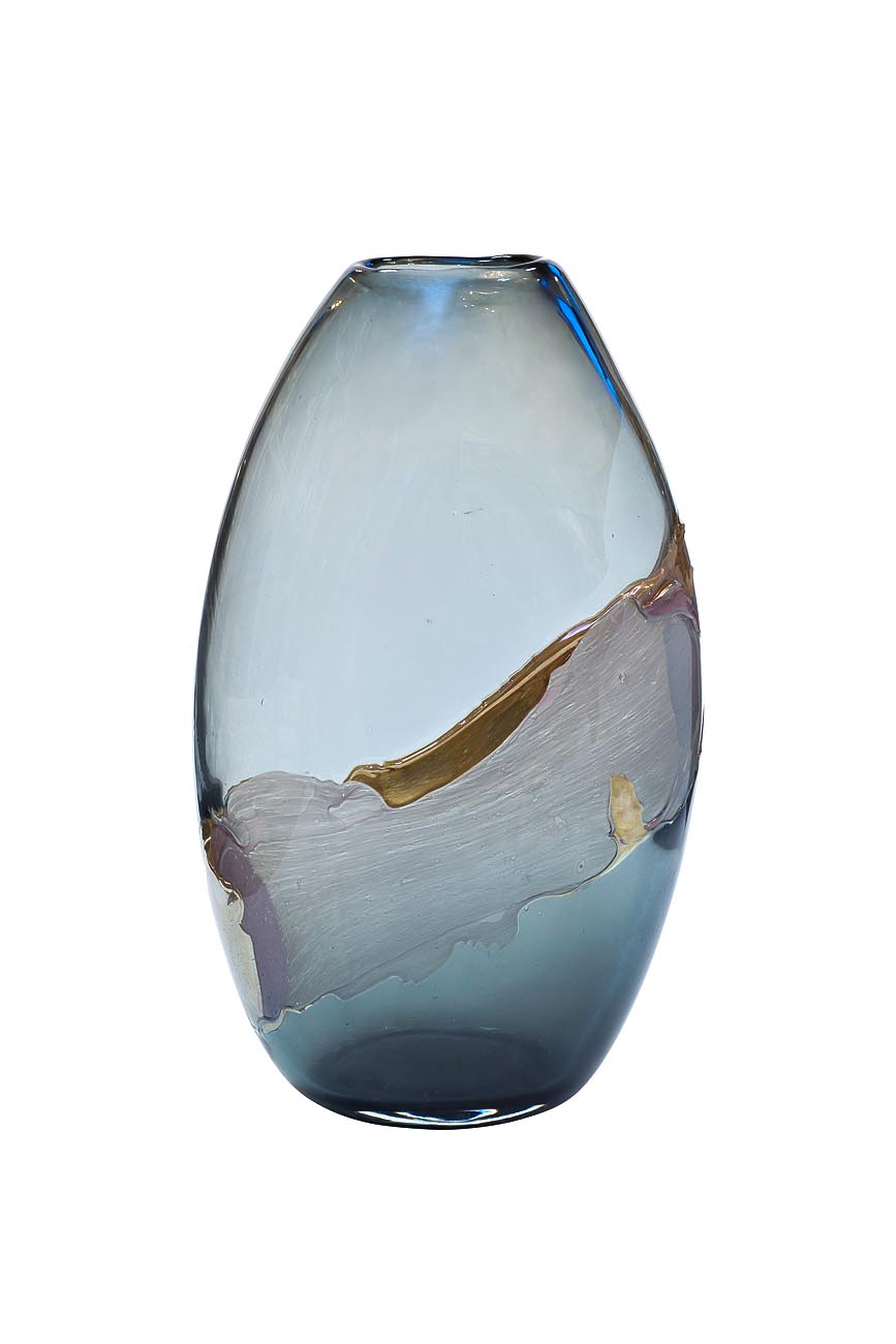Каждая ваза этой серии выполнена вручную по уникальной технологии. Рисунок ваз никогда не повторяется. Тающие голубовато-серые оттенки цветного стекла оттеняет благородный блеск матового золота. Изысканное смешение красок рождает фантастические пейзажи, дает простор воображению. Дизайнерская ваза станет прекрасным подарком, сделает интерьер авторским и особенным.