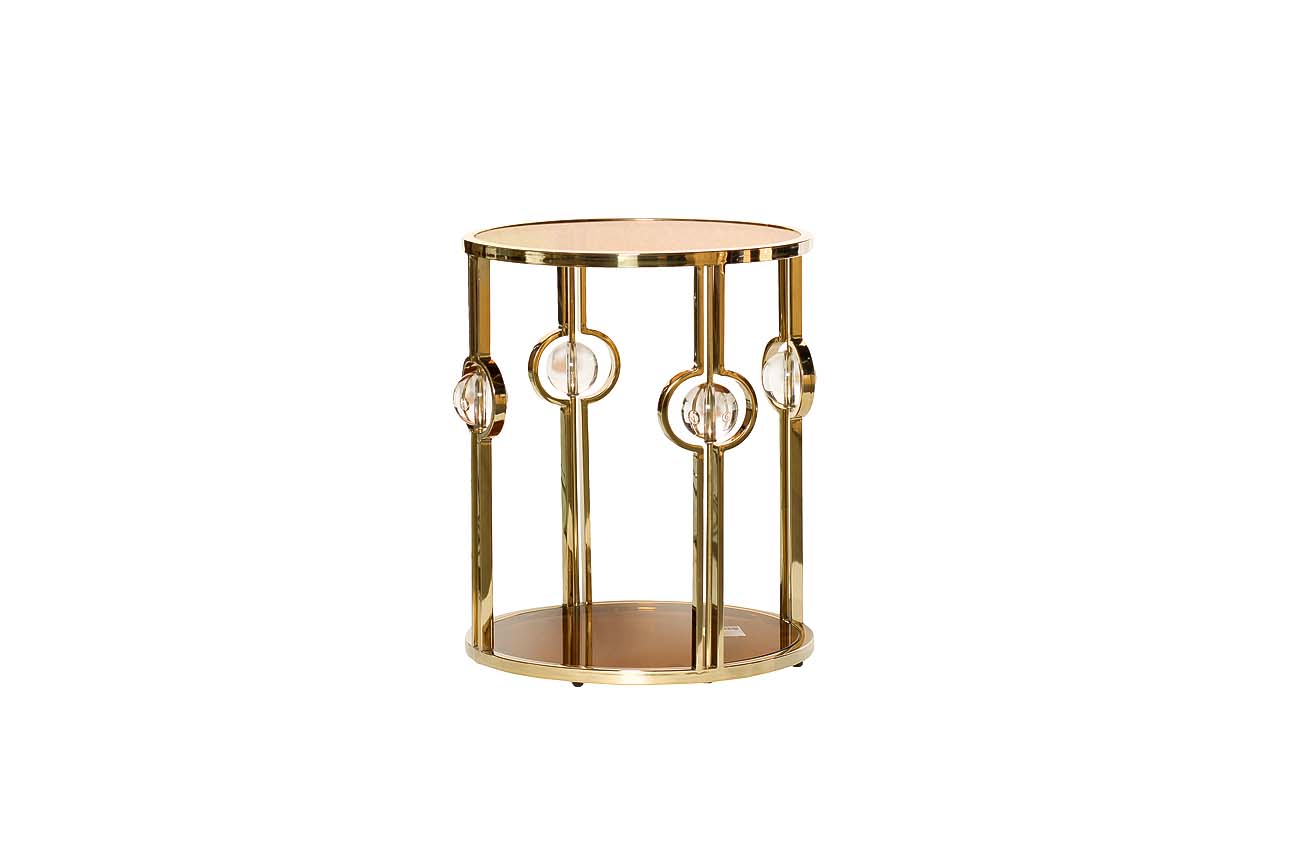 Небольшой круглый журнальный столик со столешницей из тонированного стекла и золотистыми ножками со стеклянными вставками выглядит изящно и игриво. Он создает в помещении атмосферу легкости и артистизма, прекрасно впишется в интерьер в стиле бохо-шик, фьюжн или арт-деко.
