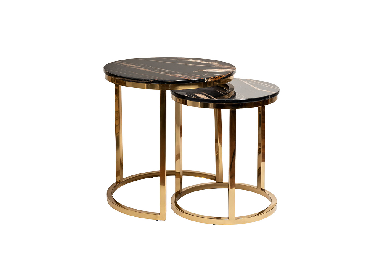 Комплект журнальных столов для гостиной – удачный выбор для гостиной, кабинета или спальной. Эти круглые журнальные столы немного различаются размерами. В результате один из них удобно задвигается под другой, экономя пространство. При необходимости столики можно раздвинуть, если у вас намечаются гости. Такой набор журнальных столов выглядит необычайно стильно и презентабельно. Мебель выполнена со вкусом, отвечает современным требованиям качества. Оригинальная опора из полированной нержавеющей стали золотого цвета эффектно сочетается со столешницей из черного искусственного мрамора с цветными прожилками.
