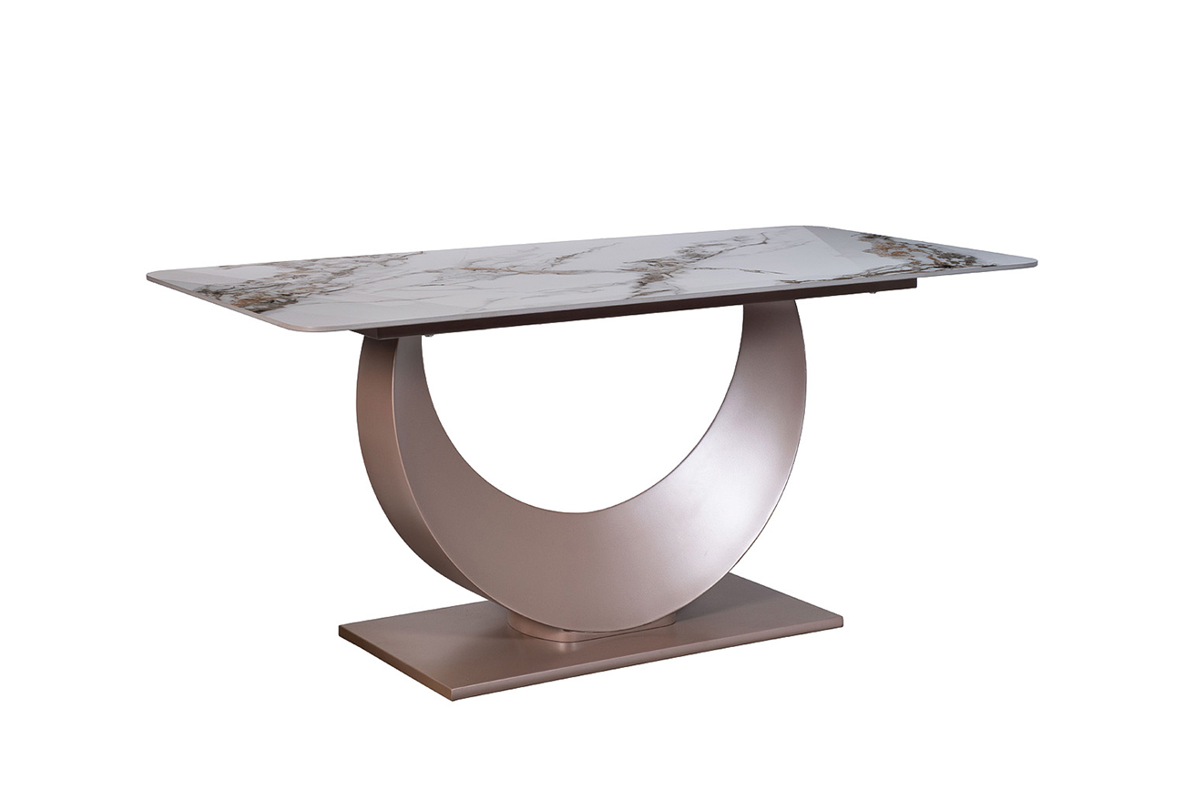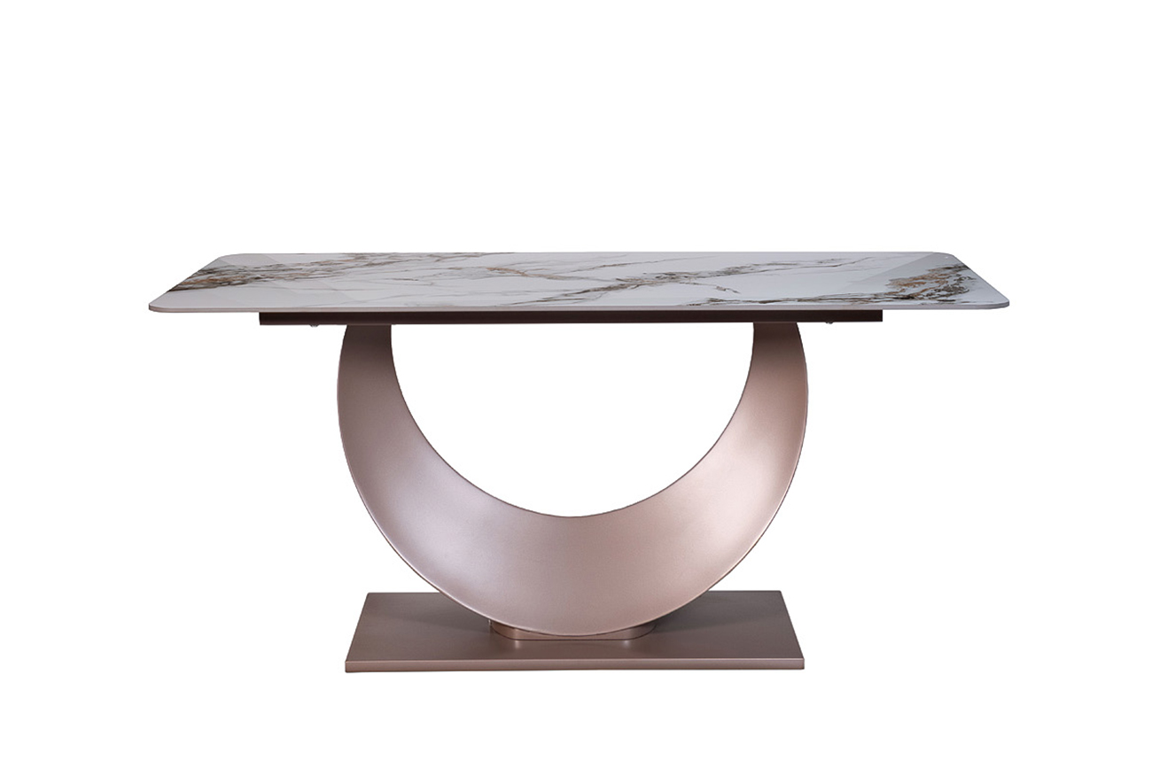 Дизайнерский стол с основанием в форме полумесяца из металла, покрашенного в золотисто-розовый цвет. Столешница изготовлена из прессованного при высокой температуре каменного конгломерата, что обеспечивает высокую степень надежности и износостойкости. Цвет изделия может незначительно отличаться от изображений на сайте в зависимости от цветопередачи вашего устройства.