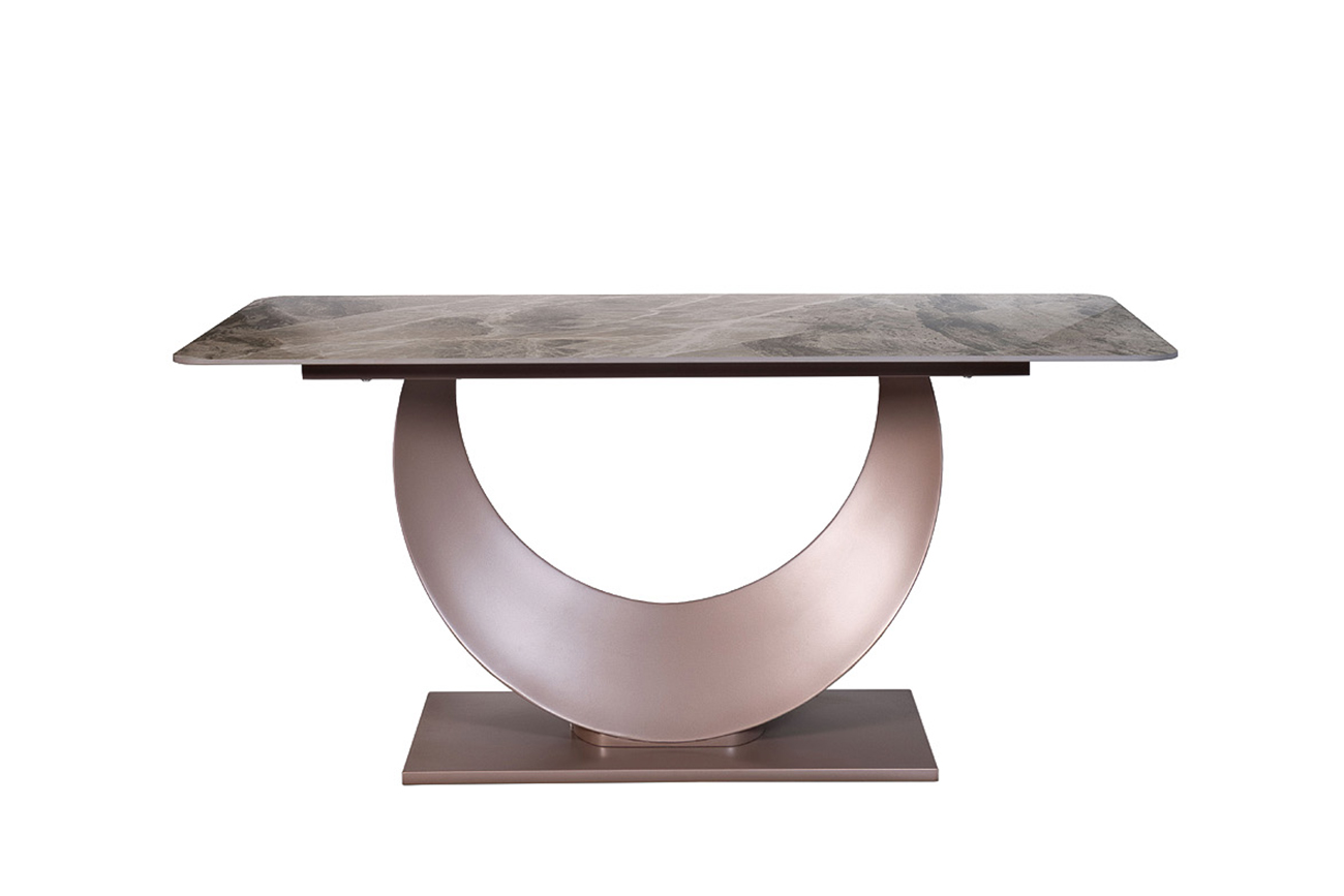 Дизайнерский стол с основанием в форме полумесяца из металла, покрашенного в золотисто-розовый цвет. Столешница изготовлена из прессованного при высокой температуре каменного конгломерата, что обеспечивает высокую степень надежности и износостойкости. Обеденный дизайнерский стол внесет нотку роскоши в обстановку столовой или кухни. Выполненный из качественных материалов, он являет собой пример дорогой статусной мебели, которая не просто выполняет свои базовые функции, а становится украшением обстановки. Обеденный прямоугольный стол идеально вписывается в стилистику ар-деко, неоклассика, шебби-шик, фьюжн. Этот стильный обеденный стол можно дополнить стульями, креслами и другой эксклюзивной мебелью из каталога Garda Decor. Цвет изделия может незначительно отличаться от изображений на сайте в зависимости от цветопередачи вашего устройства.