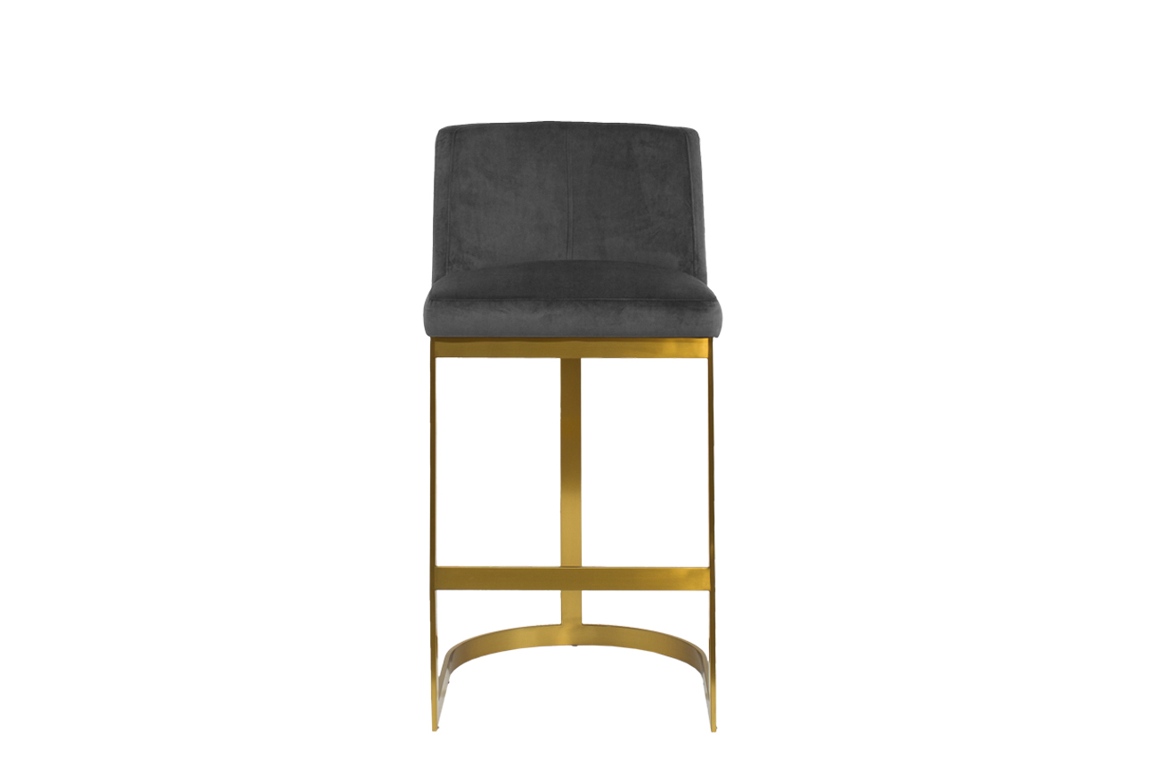 Дизайнерский барный стул на легкой и прочной металлической опоре с невысокой полукруглой спинкой отражает последние тенденции мебельной моды. Сочетание необычной формы с велюром благородного серого цвета и золотистым металлом придает стулу сдержанную экстравагантность и шик. Такой стул прекрасно впишется в интерьер кухни, столовой или бара в европейском или скандинавском стиле, а также в стиле фьюжн.