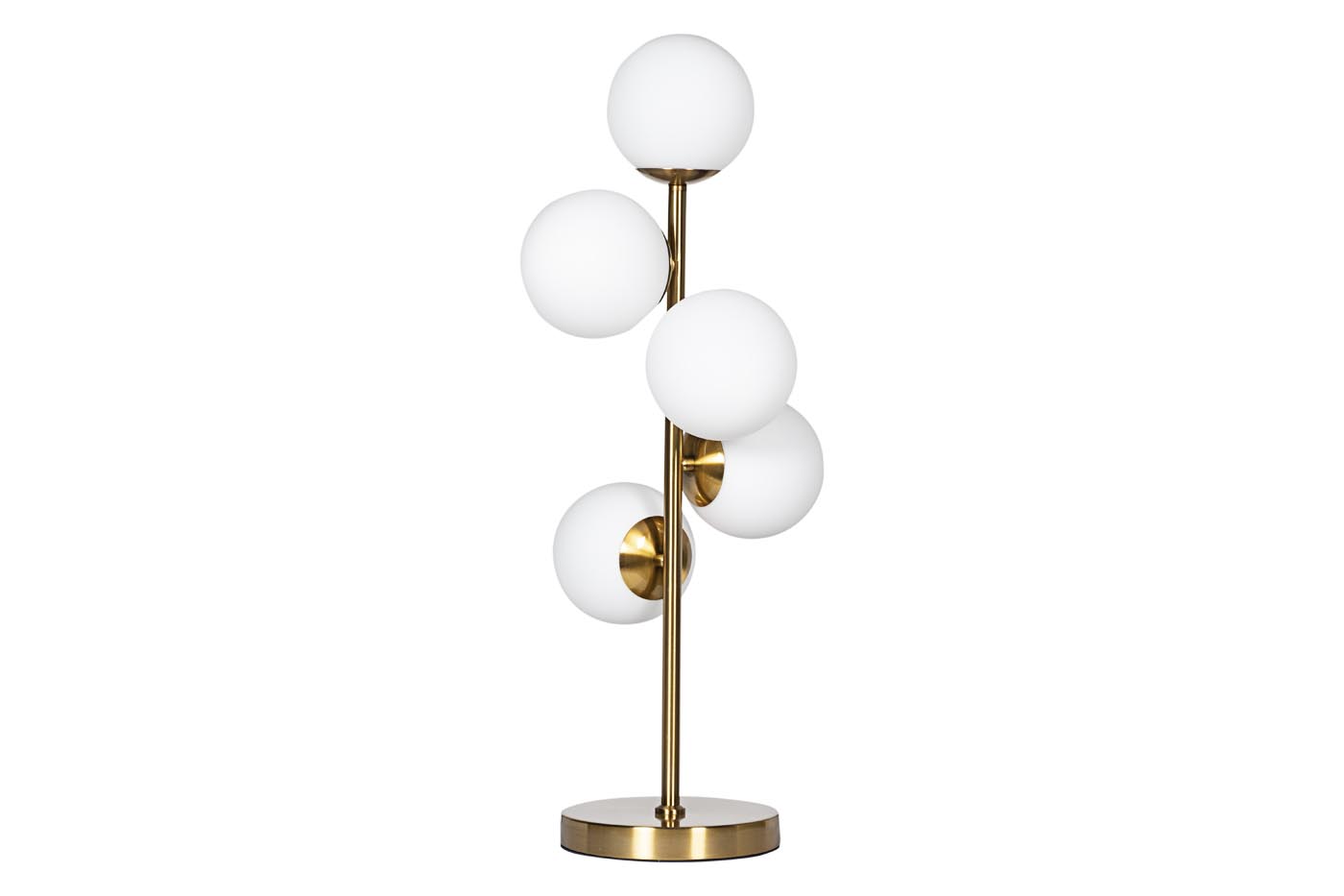 Новое прочтение классического светильника в стиле ар-деко: пять небольших шаров-плафонов из молочно-белого стекла обвивают по спирали латунное основание. Лампа станет прекрасным дополнением потолочным люстрам, настенным бра и торшерам схожего дизайна, чтобы выстроить в помещении многоуровневое освещение в едином стиле. В спальне или кабинете эта настольная лампа также прекрасно исполнит и сольную партию, наполнив комнату мягким жемчужным светом.
