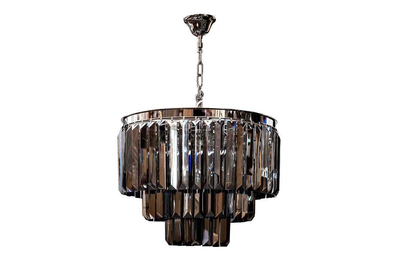 Потолочный светильник с подвесками из дымчатых граненых кристаллов придаст любой комнате шик, изысканность и актуальность. Хромированная сталь подчеркивает красоту и мерцающий блеск граненых кристаллов, классическая трехярусная форма люстры подойдет практически для любого интерьера в классическом или современном стиле. За последний год люстры такого дизайна стали особенно актуальными в интерьерах от ведущих европейских и североамериканских дизайнеров. Сочетайте люстру в интерьере с зеркалами, декоративными украшениями и мебелью из полированного металла, чтобы создать необыкновенно эффектный авторский ансамбль. Местное освещение можно создать при помощи бра из той же коллекции арт. 15-B6901-2NI.