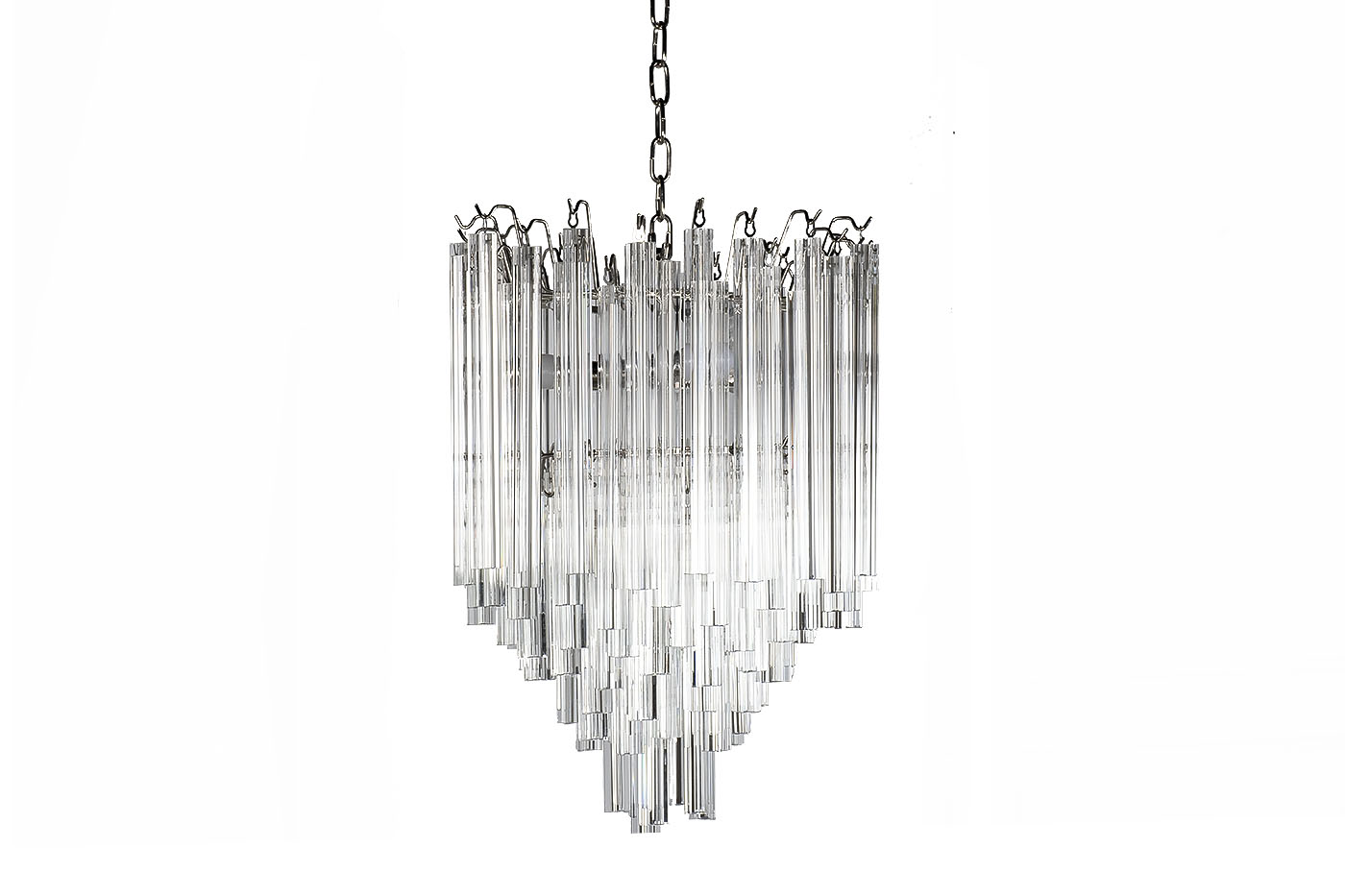 Дизайнерская люстра состоит из множества стеклянных элементов, которые спускаются в виде каскада. Акцентированная геометрия стеклянных форм дополнена изящными элементами из хромированного металла. Люстра прекрасно впишется в классический интерьер или в стилистику ар-деко, выглядит сдержанно и роскошно.