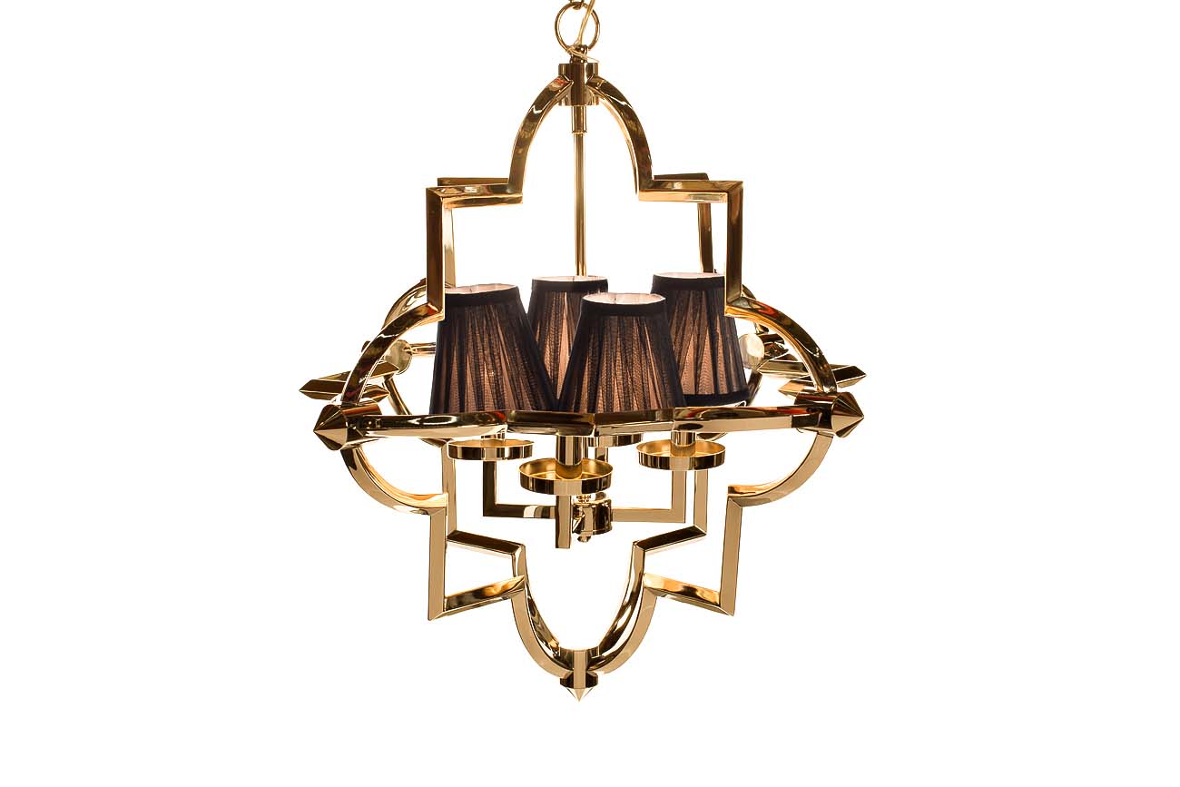 Данная модель является совершенно уникальной благодаря сочетанию материалов. Присутствующий в оформлении цвет потолочного светильника – золото, что в сочетании с черными абажурами дает роскошный эффект. Стилистически его можно отнести к потолочным ретро-светильникам. Нетривиальная форма делаю его идеальным для самобытных стилей интерьера, которые сложно перепутать с любыми другими. Потолочный светильник с тканевым чёрным плафоном станет актуальным и для современных интерьеров, выполняя в них роль того элемента, на которой все обращают свое внимание. Цена потолочного светильника позволяет выгодно приобрести стильное дизайнерское решение. Рекомендуемая площадь освещения 8 м2
