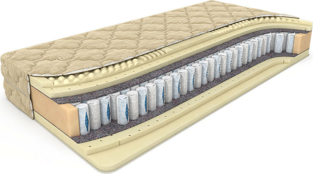 Над пружинами располагается слой перфорированного латекса, за ним идет самый верхний комфортный слой - 7-зональный латекс. Это помогает позвоночнику принять правильное положение. Латекс – это пористый материал, хорошо вентилируемый. Это позволяет матрасу «дышать» и сохранять оптимальную температуру зимой и летом. Особая структура 7-зонального латекса снимает напряжение, оказывает микро-массажный эффект, что благоприятно сказывается на кровотоке.