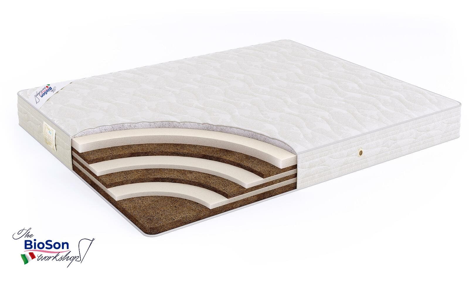Матрас BioSon Active Flex - состоит из чередующихся слоев умеренно мягкого слоя «Polilatex» и жесткого кокоса. Блок, набранный из таких слоев имеет умеренную среднюю жесткость по всей своей глубине, плотный и упругий на сжатие при нагрузке.