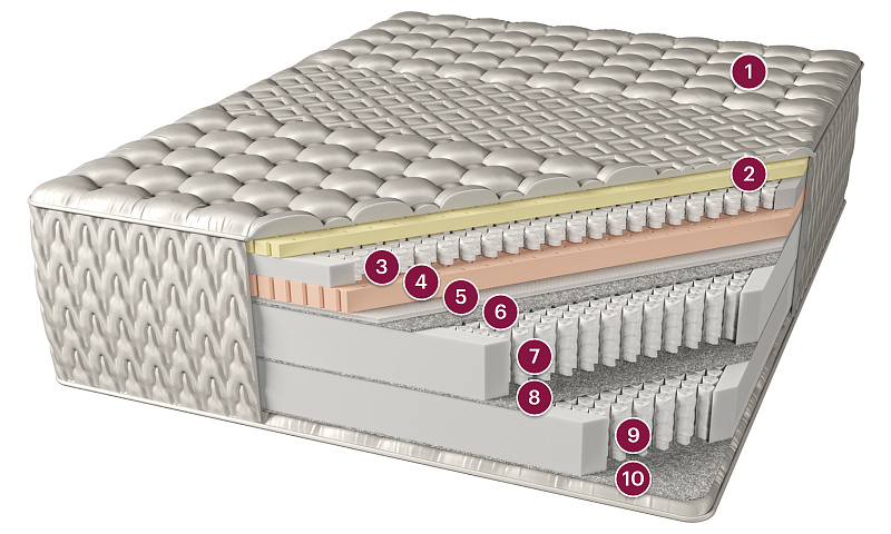 О торговой марке Kruage Холдинг Consul разработал luxury-коллекцию матрасов и воплотил наивысшее качество в новой торговой марке «Kruage». Матрасы «Kruage» удовлетворят самые взыскательные вкусы и пожелания господ, ценящих исключительный комфорт и роскошь. Особенность «Kruage» — использование сложных систем запатентованных пружинных блоков, что создает наивысшую степень комфорта и сверхортопедический эффект. Состав: 90% хлопок, 10% полиэстер Наполнитель: гипоаллергенное волокно холфитекс Комплектация: смотровая молния Натуральный материал, представляющий собой вспененный экстракт сока каучукового дерева. Благодаря специальной обработке латекс приобретает микропористую структуру, подобную строению пчелиных сот, с заполненными воздухом ячейками. Динамические и статические характеристики латекса, его устойчивость к воздействию внешней среды, термостабильность и экологичность делают этот материал идеальным наполнителем для мягких матрасов. Синтетический гипоаллергенный материал не имеющий аналогов среди материалов, применяемых в мебельной промышленности. Особенность этого материала в способности «запоминать» форму тела, оказывающего на него давление под действием тепла. Мемориформ подстраивается под контуры лежащего на матрасе человека и, «запомнив» его силуэт, не «выталкивает» его, не оказывает ответного давления. В результате появляется эффект невесомости, полное ощущение комфорта и отсутствие каких-либо проблем с недостатком кровоснабжения сосудов, которые ничто не сдавливает. На матрасе с наполнителем из мемориформа можно проспать всю ночь ни разу не перевернувшись на другой бок, вряд ли какой-нибудь другой матрас может «похвастаться» этим. Трикотажная прокладочная ткань (также именуемая 3D спейсер или трикотажная сетка) является инновационным продуктом, который обеспечивает высокую воздухопроницаемость и минимальное поглощение воды и влаги. 3D спейсеры используется в качестве замены для пены внутри продуктов, таких как матрасы, диваны, подушки, автомобильные сидения, и т. д. По сравнению с пеной, объёмные трикотажные сетки предлагает высокую степень проницаемости воздуха и чрезвычайно низкой абсорбции воды. Прочный материал, он состоит из шерсти и синтетических волокон, которые соединены между собой и спрессованы при высокой температуре. Такая обработка придает высокую прочность и износоустойчивость. Блок с повышенным количеством пружин и малой высотой (5 см.), который создаёт мягкость и комфорт верхней части изделия, а так же обеспечивает прекрасную вентиляцию. Пружинный блок 2-Cvadro cостоит из двух отдельных блоков независимых пружин, расположенных один над другим. Эффект «мягкого сжатия» за счет увеличения высоты пружины и её витков приводит к более комфортному восприятию воздействия матраса на тело человека. Общая высота увеличивается до 300 мм. Преимущества: • Более равномерное распределение веса тела по поверхности; • Увеличение ортопедического эффекта; • Дополнительно увеличивает уровень поддержки спиной и поясничной зоны человека; • Снимает спинное напряжение; • Снимает усталость при утомлении; • Снижает напряжение в мышцах; • Обладает более глубоким точечным массажным эффектом; • Обеспечивает более глубокий здоровый сон
