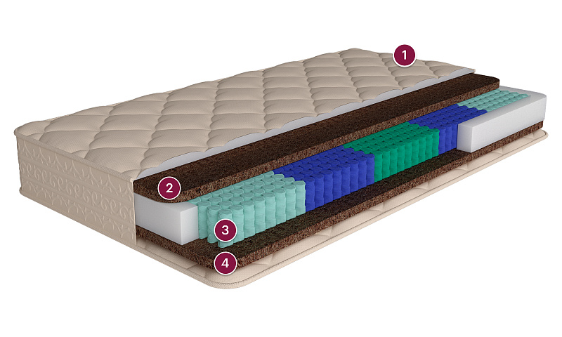 Состав: 80% хлопок, 20% полиэстер Наполнитель: гипоаллергенное волокно холфитекс Комплектация: смотровая молния Экологически чистый, долговечный природный материал, получаемый из межплодника ореха кокосовой пальмы, произрастающей в тропических районах Юго-Восточной Азии. Будучи натуральным материалом, койра, тем не менее, не вызывает аллергических реакций, и наоборот, выросшее под солнцем тропиков, кокосовое волокно впитало в себя огромный запас энергии, которая создает на много лет мощное благотворное биополе. В качестве наполнителя для матрасов кокосовая койра обеспечивает оптимальную упругость и долговечность матраса. Для устранения ломкости и увеличения срока эксплуатации, кокосовое волокно пропитывают латексом. На выходе получается монолитная плита: прочная и долговечная. Латексная пропитка позволяет выдерживать большие нагрузки и препятствует деформации и расслаиванию наполнителя. Блок комбинированных пружин с 5-ю зонами жёсткости H — Жёсткая зона в пружинном блоке «Мультипакет» (660 шт/м²) M — Средняя по жёсткости зона в независимом пружинном блоке (340 шт/м²) 2H — Зона повышенной жёсткости в пружинном блоке «Мультипакет» (660 шт/м²)