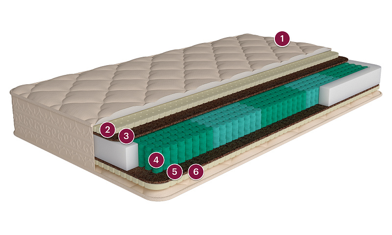 Состав: 80% хлопок, 20% полиэстер Наполнитель: гипоаллергенное волокно холфитекс Комплектация: смотровая молния Натуральный материал, представляющий собой вспененный экстракт сока каучукового дерева. Благодаря специальной обработке латекс приобретает микропористую структуру, подобную строению пчелиных сот, с заполненными воздухом ячейками. Динамические и статические характеристики латекса, его устойчивость к воздействию внешней среды, термостабильность и экологичность делают этот материал идеальным наполнителем для мягких матрасов. Экологически чистый, долговечный природный материал, получаемый из межплодника ореха кокосовой пальмы, произрастающей в тропических районах Юго-Восточной Азии. Будучи натуральным материалом, койра, тем не менее, не вызывает аллергических реакций, и наоборот, выросшее под солнцем тропиков, кокосовое волокно впитало в себя огромный запас энергии, которая создает на много лет мощное благотворное биополе. В качестве наполнителя для матрасов кокосовая койра обеспечивает оптимальную упругость и долговечность матраса. Для устранения ломкости и увеличения срока эксплуатации, кокосовое волокно пропитывают латексом. На выходе получается монолитная плита: прочная и долговечная. Латексная пропитка позволяет выдерживать большие нагрузки и препятствует деформации и расслаиванию наполнителя. Блок пружин «Мультипакет» с 5-ю зонам жёсткости 2H — Зона повышенной жёсткости в пружинном блоке «Мультипакет» (660 шт/м²) H — Жёсткая зона в пружинном блоке «Мультипакет» (660 шт/м²)