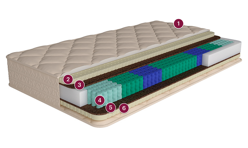 Состав: 80% хлопок, 20% полиэстер Наполнитель: гипоаллергенное волокно холфитекс Комплектация: смотровая молния Натуральный материал, представляющий собой вспененный экстракт сока каучукового дерева. Благодаря специальной обработке латекс приобретает микропористую структуру, подобную строению пчелиных сот, с заполненными воздухом ячейками. Динамические и статические характеристики латекса, его устойчивость к воздействию внешней среды, термостабильность и экологичность делают этот материал идеальным наполнителем для мягких матрасов. Экологически чистый, долговечный природный материал, получаемый из межплодника ореха кокосовой пальмы, произрастающей в тропических районах Юго-Восточной Азии. Будучи натуральным материалом, койра, тем не менее, не вызывает аллергических реакций, и наоборот, выросшее под солнцем тропиков, кокосовое волокно впитало в себя огромный запас энергии, которая создает на много лет мощное благотворное биополе. В качестве наполнителя для матрасов кокосовая койра обеспечивает оптимальную упругость и долговечность матраса. Для устранения ломкости и увеличения срока эксплуатации, кокосовое волокно пропитывают латексом. На выходе получается монолитная плита: прочная и долговечная. Латексная пропитка позволяет выдерживать большие нагрузки и препятствует деформации и расслаиванию наполнителя. Блок комбинированных пружин с 7-ю зонами жёсткости H — Жёсткая зона в пружинном блоке «Мультипакет» (660 шт/м²) 2H — Зона повышенной жёсткости в пружинном блоке «Мультипакет» (660 шт/м²) M — Средняя по жёсткости зона в независимом пружинном блоке (340 шт/м²)