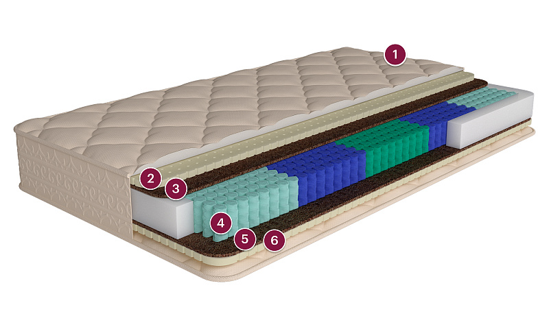 Состав: 80% хлопок, 20% полиэстер Наполнитель: гипоаллергенное волокно холфитекс Комплектация: смотровая молния Натуральный материал, представляющий собой вспененный экстракт сока каучукового дерева. Благодаря специальной обработке латекс приобретает микропористую структуру, подобную строению пчелиных сот, с заполненными воздухом ячейками. Динамические и статические характеристики латекса, его устойчивость к воздействию внешней среды, термостабильность и экологичность делают этот материал идеальным наполнителем для мягких матрасов. Экологически чистый, долговечный природный материал, получаемый из межплодника ореха кокосовой пальмы, произрастающей в тропических районах Юго-Восточной Азии. Будучи натуральным материалом, койра, тем не менее, не вызывает аллергических реакций, и наоборот, выросшее под солнцем тропиков, кокосовое волокно впитало в себя огромный запас энергии, которая создает на много лет мощное благотворное биополе. В качестве наполнителя для матрасов кокосовая койра обеспечивает оптимальную упругость и долговечность матраса. Для устранения ломкости и увеличения срока эксплуатации, кокосовое волокно пропитывают латексом. На выходе получается монолитная плита: прочная и долговечная. Латексная пропитка позволяет выдерживать большие нагрузки и препятствует деформации и расслаиванию наполнителя. Блок комбинированных пружин с 5-ю зонами жёсткости H — Жёсткая зона в пружинном блоке «Мультипакет» (660 шт/м²) M — Средняя по жёсткости зона в независимом пружинном блоке (340 шт/м²) 2H — Зона повышенной жёсткости в пружинном блоке «Мультипакет» (660 шт/м²)