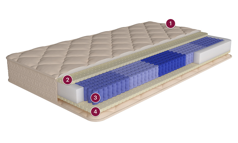 Состав: 80% хлопок, 20% полиэстер Наполнитель: гипоаллергенное волокно холфитекс Комплектация: смотровая молния Натуральный материал, представляющий собой вспененный экстракт сока каучукового дерева. Благодаря специальной обработке латекс приобретает микропористую структуру, подобную строению пчелиных сот, с заполненными воздухом ячейками. Динамические и статические характеристики латекса, его устойчивость к воздействию внешней среды, термостабильность и экологичность делают этот материал идеальным наполнителем для мягких матрасов. Блок независимых пружин с 5-ю зонами жёсткости S — Мягкая зона в независимом пружинном блоке (340 шт/м²) 2S — Очень мягкая зона в независимом пружинном блоке (340 шт/м²) M — Средняя по жёсткости зона в независимом пружинном блоке (340 шт/м²)
