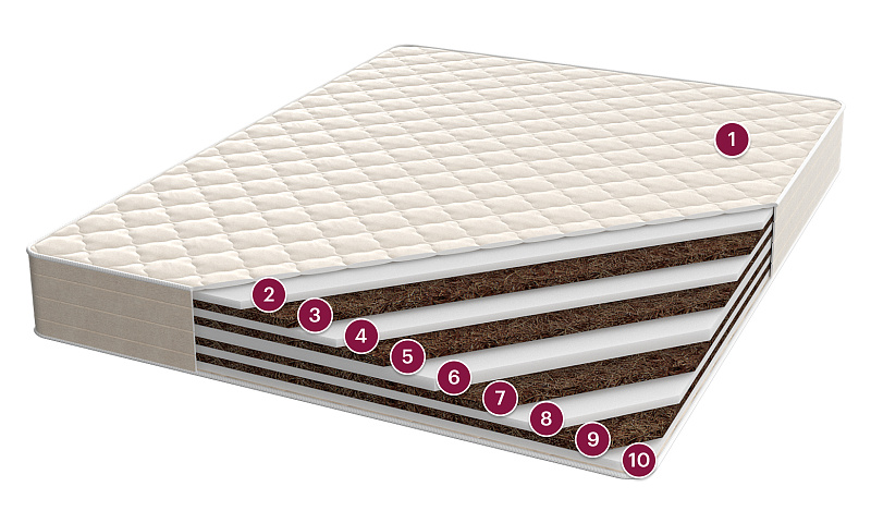 Состав ткани: 50% хлопок, 50% полиэстер Наполнитель: гипоаллергенное волокно холфитекс Ортопена — пенополиуретан, обладающий модернизированной структурой, более высокими параметрами. Благодаря новой технологии изготовления, обыкновенный пенополиуретан смог стать упругим, жаростойким, плотным материалом. Ортопена в своем составе содержит более 90% процентов воздуха. Это смягчающий и опорный материал, который обладает эластичностью и упругостью. Она не крошится, не слёживается, отсутствует проминание. Абсолютно безопасна и гипоаллергенна. Экологически чистый, долговечный природный материал, получаемый из межплодника ореха кокосовой пальмы, произрастающей в тропических районах Юго-Восточной Азии. Будучи натуральным материалом, койра, тем не менее, не вызывает аллергических реакций, и наоборот, выросшее под солнцем тропиков, кокосовое волокно впитало в себя огромный запас энергии, которая создает на много лет мощное благотворное биополе. В качестве наполнителя для матрасов кокосовая койра обеспечивает оптимальную упругость и долговечность матраса. Для устранения ломкости и увеличения срока эксплуатации, кокосовое волокно пропитывают латексом. На выходе получается монолитная плита: прочная и долговечная. Латексная пропитка позволяет выдерживать большие нагрузки и препятствует деформации и расслаиванию наполнителя.