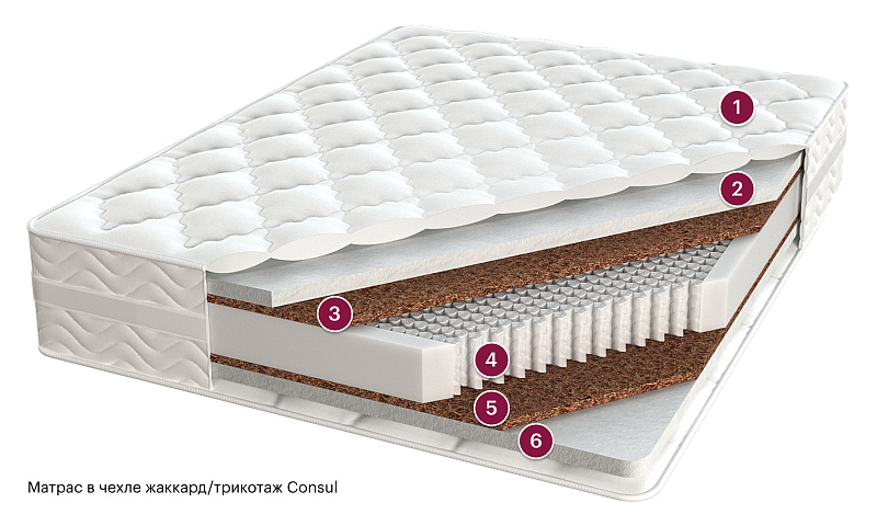 Состав ткани: • Жаккард или трикотаж Consul — 75% хлопок, 25% полиэстер • Жаккард Kruage — 90% хлопок, 10% полиэстер Наполнитель: гипоаллергенное волокно холфитекс Комплектация: смотровая молния Синтетический гипоаллергенный материал не имеющий аналогов среди материалов, применяемых в мебельной промышленности. Особенность этого материала в способности «запоминать» форму тела, оказывающего на него давление под действием тепла. Мемориформ подстраивается под контуры лежащего на матрасе человека и, «запомнив» его силуэт, не «выталкивает» его, не оказывает ответного давления. В результате появляется эффект невесомости, полное ощущение комфорта и отсутствие каких-либо проблем с недостатком кровоснабжения сосудов, которые ничто не сдавливает. На матрасе с наполнителем из мемориформа можно проспать всю ночь ни разу не перевернувшись на другой бок, вряд ли какой-нибудь другой матрас может «похвастаться» этим. Экологически чистый, долговечный природный материал, получаемый из межплодника ореха кокосовой пальмы, произрастающей в тропических районах Юго-Восточной Азии. Будучи натуральным материалом, койра, тем не менее, не вызывает аллергических реакций, и наоборот, выросшее под солнцем тропиков, кокосовое волокно впитало в себя огромный запас энергии, которая создает на много лет мощное благотворное биополе. В качестве наполнителя для матрасов кокосовая койра обеспечивает оптимальную упругость и долговечность матраса. Для устранения ломкости и увеличения срока эксплуатации, кокосовое волокно пропитывают латексом. На выходе получается монолитная плита: прочная и долговечная. Латексная пропитка позволяет выдерживать большие нагрузки и препятствует деформации и расслаиванию наполнителя. Одной из самых популярных разновидностей независимого пружинного блока является «Consul 660», который, благодаря увеличенному количеству пружин (660 на квадратный метр), обладает повышенной ортопедичностью, выдерживает большие нагрузки и обеспечивает высокую эластичность, улучшающую кровообращение и создающую легкий массажный эффект.