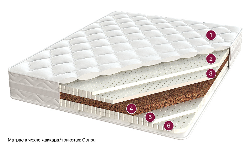 Состав ткани: • Жаккард или трикотаж Consul — 75% хлопок, 25% полиэстер • Жаккард Kruage — 90% хлопок, 10% полиэстер Наполнитель: гипоаллергенное волокно холфитекс Комплектация: смотровая молния Натуральный материал, представляющий собой вспененный экстракт сока каучукового дерева. Благодаря специальной обработке латекс приобретает микропористую структуру, подобную строению пчелиных сот, с заполненными воздухом ячейками. Динамические и статические характеристики латекса, его устойчивость к воздействию внешней среды, термостабильность и экологичность делают этот материал идеальным наполнителем для мягких матрасов. Экологически чистый, долговечный природный материал, получаемый из межплодника ореха кокосовой пальмы, произрастающей в тропических районах Юго-Восточной Азии. Будучи натуральным материалом, койра, тем не менее, не вызывает аллергических реакций, и наоборот, выросшее под солнцем тропиков, кокосовое волокно впитало в себя огромный запас энергии, которая создает на много лет мощное благотворное биополе. В качестве наполнителя для матрасов кокосовая койра обеспечивает оптимальную упругость и долговечность матраса. Для устранения ломкости и увеличения срока эксплуатации, кокосовое волокно пропитывают латексом. На выходе получается монолитная плита: прочная и долговечная. Латексная пропитка позволяет выдерживать большие нагрузки и препятствует деформации и расслаиванию наполнителя.