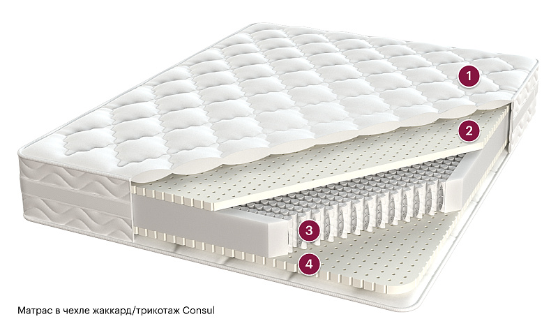 Состав ткани: • Жаккард или трикотаж Consul — 75% хлопок, 25% полиэстер • Жаккард Kruage — 90% хлопок, 10% полиэстер Наполнитель: гипоаллергенное волокно холфитекс Комплектация: смотровая молния Натуральный материал, представляющий собой вспененный экстракт сока каучукового дерева. Благодаря специальной обработке латекс приобретает микропористую структуру, подобную строению пчелиных сот, с заполненными воздухом ячейками. Динамические и статические характеристики латекса, его устойчивость к воздействию внешней среды, термостабильность и экологичность делают этот материал идеальным наполнителем для мягких матрасов. Особенностью блока независимых пружин «Дуэт» является расположение пружины меньшего диаметра внутри второй пружины, что обеспечивает одновременно мягкость и упругость матраса и идеально подходит для партнёров с большой разницей в весе, которым будет одинаково комфортно спать на матрасе. Данная технология позволяет сочетать два свойства: мягкость (при малой нагрузке) и упругость (при увеличении нагрузки), что позволяет людям разных весовых категорий чувствовать себя оптимально комфортно. Высота пружинного блока 15 см., толщина проволоки -1,8/1,4 мм., диаметр пружин 6,2/4,2 см., количество пружин 660 шт/м².