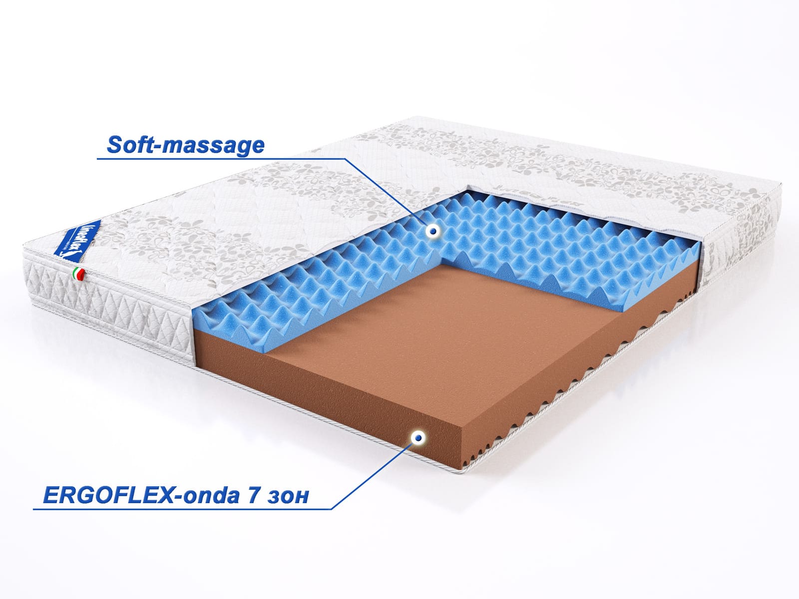Нижняя часть ERGOFLEX-onda – недеформируемая, высокоэластичная пена ERGOFLEX с волнообразной 7-ми зональной поверхностью. Ergoflex - пенополиуретановая пена на водной основе. Молекулярная структура такой пены обеспечивает 100% циркуляцию воздуха, таким образом поддерживается идеальная температура и влажность спального места.