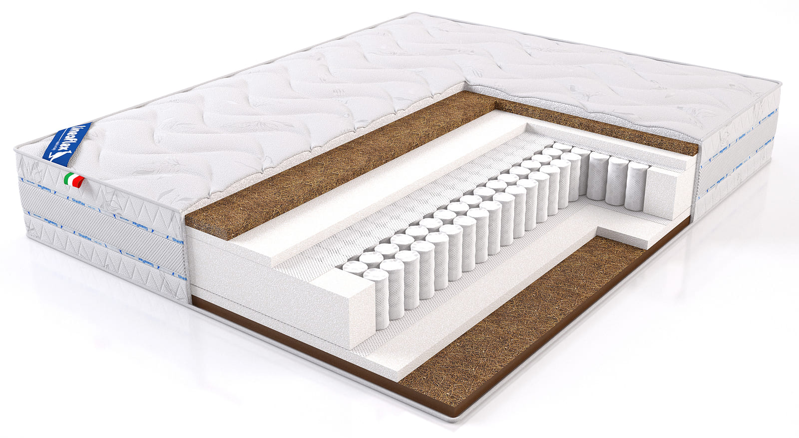 Кокосовая койра - великолепный натуральный материал, в сочетании с блоком независимых пружин обеспечит комфортный сон. Кокосовое волокно, применяемое при производстве матраса, представляет собой пропитанные латексом (латексированные) термоскрепленные плиты. Высокое содержание латекса (50%) обеспечивает материалу упругость и устойчивость к нагрузкам. Экологичность, природная эластичность и хорошая воздухопроницаемость плит из кокосового волокна делают поверхность матраса жесткой и упругой. Кокосовая койра бладает уникальным сочетанием свойств: прочность, упругость, устойчивость к любой влажности, воздухопроницаемость, антиаллергенность.