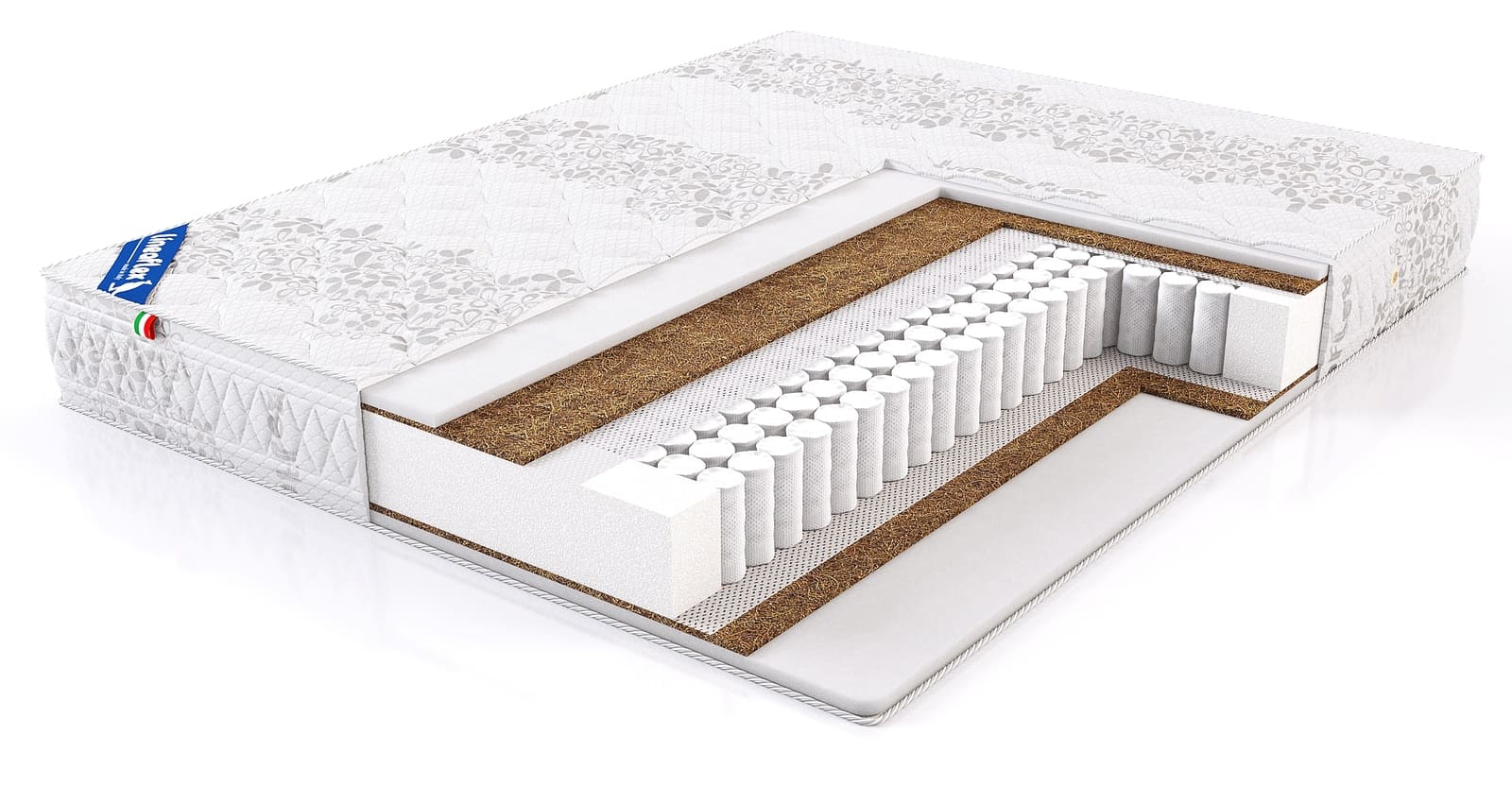 Великолепно сбалансированный матрас. Комфорт достигается за счет гармоничного сочетания упругости кокосовой койры и эластичностой пены ERGOFLEX.