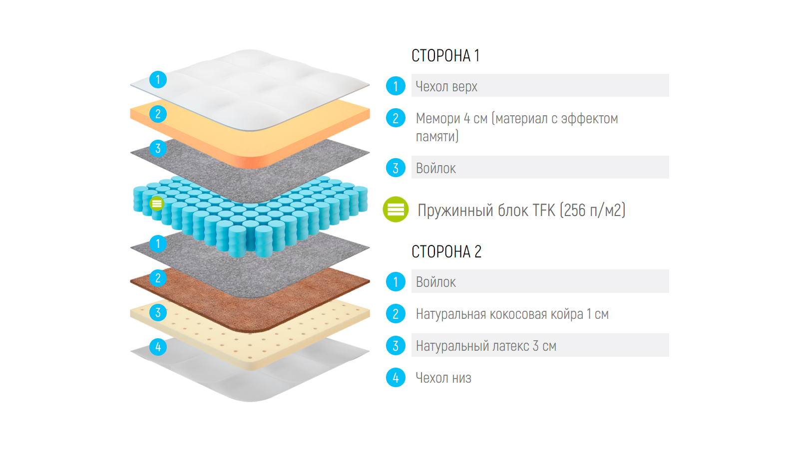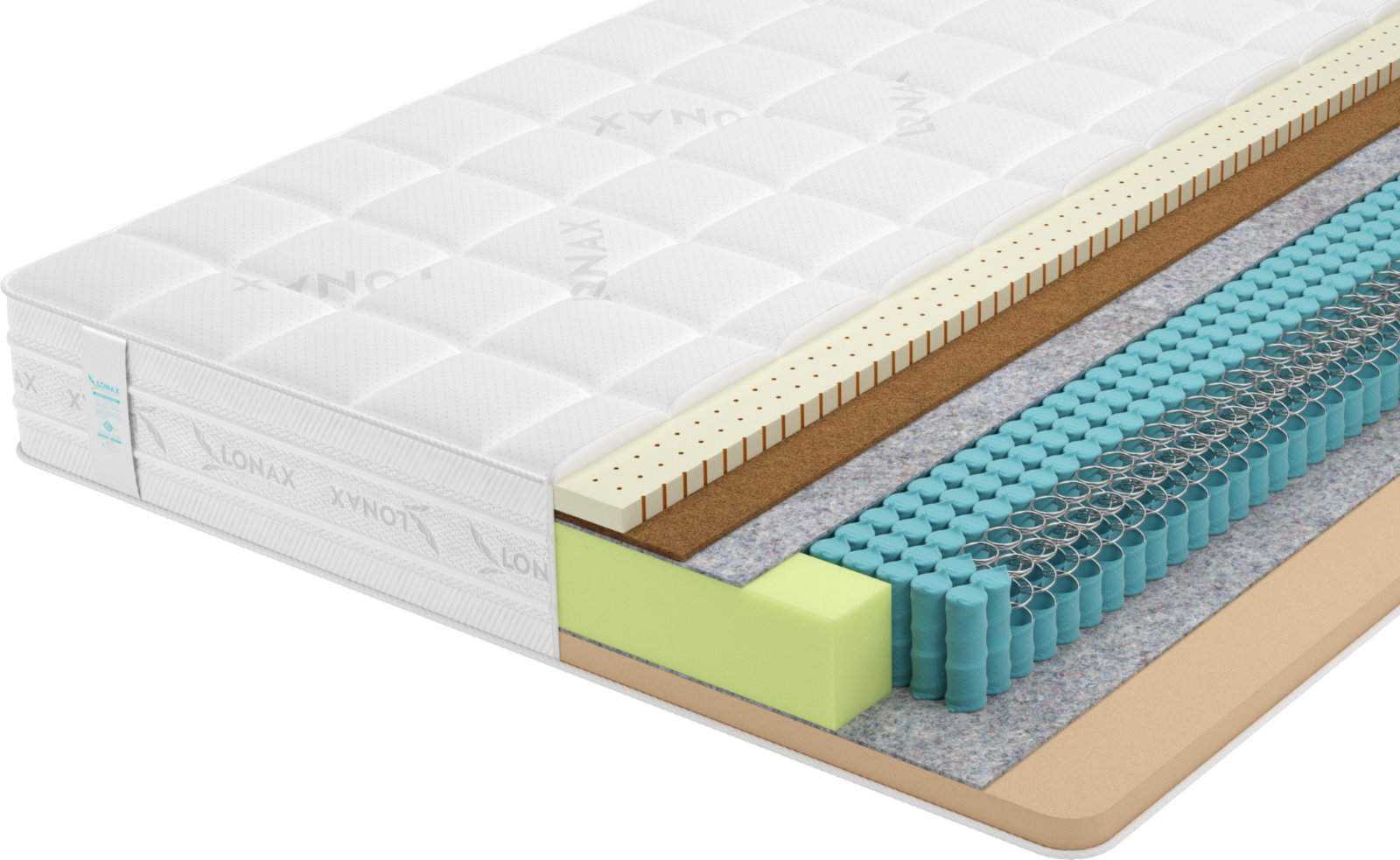 Модель Lonax Hollo-Cocos это сочетание двух материалов нетканого материала Холлкона (Strutto) и латексированной кокосовой койры. Нетканый материал Холлкон (Strutto) является искусственным и экологически чистым. Латексированная кокосовая койра - 100% натуральный жесткий материал, изготавливаемый из пролатексированных кокосовых волокон.