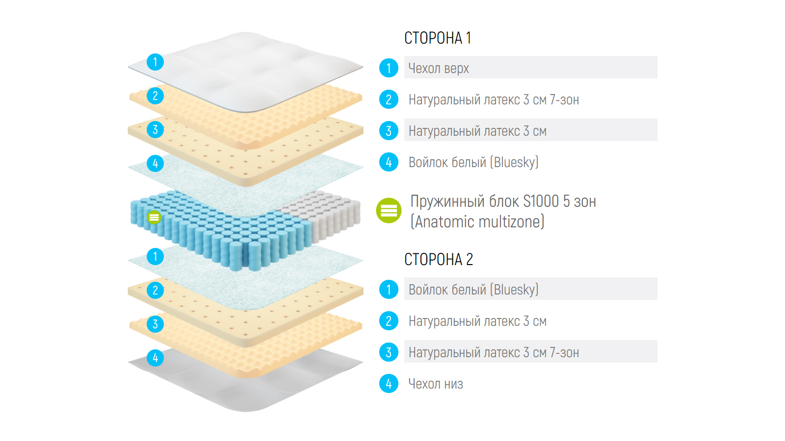Беспружинный ортопедический матрас Kleman (Клеман) с разной жёсткостью сторон выполнен на основе натурального латекса и кокосовой койры. Помимо уникальных ортопедических качеств данный матрас обладает оригинальным дизайнерским чехлом, выполненным на основе мягкого велюра. 7 зон латекса для максимального комфорта. Уникальный по своей комфортности 7-ми зонный блок на основе перфорированного латекса обеспечивает разную степень упругости для каждой зоны тела. Жёсткость каждой из 7-ми зон материала оптимально подобрана для того, чтобы Ваше тело находилось в естественном положении и не испытывало дискомфорта в какой бы позе Вы ни спали. Терморегуляция и воздухообмен. Проблема поддержание оптимального микроклимата внутри спального места решана применением в конструкции данного матраса перфорации по всей высоте латексного слоя. Кроме того, чехол из "дышащей" ткани обеспечивает беспрепятственную циркуляцию воздуха внутри матраса.