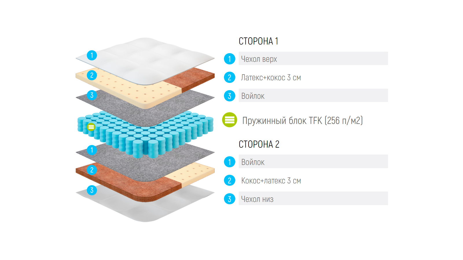 Модель Lonax Duet Cocos-Latex обладает отличным ортопедическим эффектом. В этой модели используются натуральные материалы: Латекс - 100% натуральный мягкий материал, изготавливаемый из млечного сока каучуконосных растений и латексированная кокосовая койра - 100% натуральный жесткий материал, изготавливаемый из пролатексированных кокосовых волокон. Данный матрас отлично подходит для двух людей с большой разницей в весе (более 60 кг). Каждое спальное местно обладает своей жесткостью.