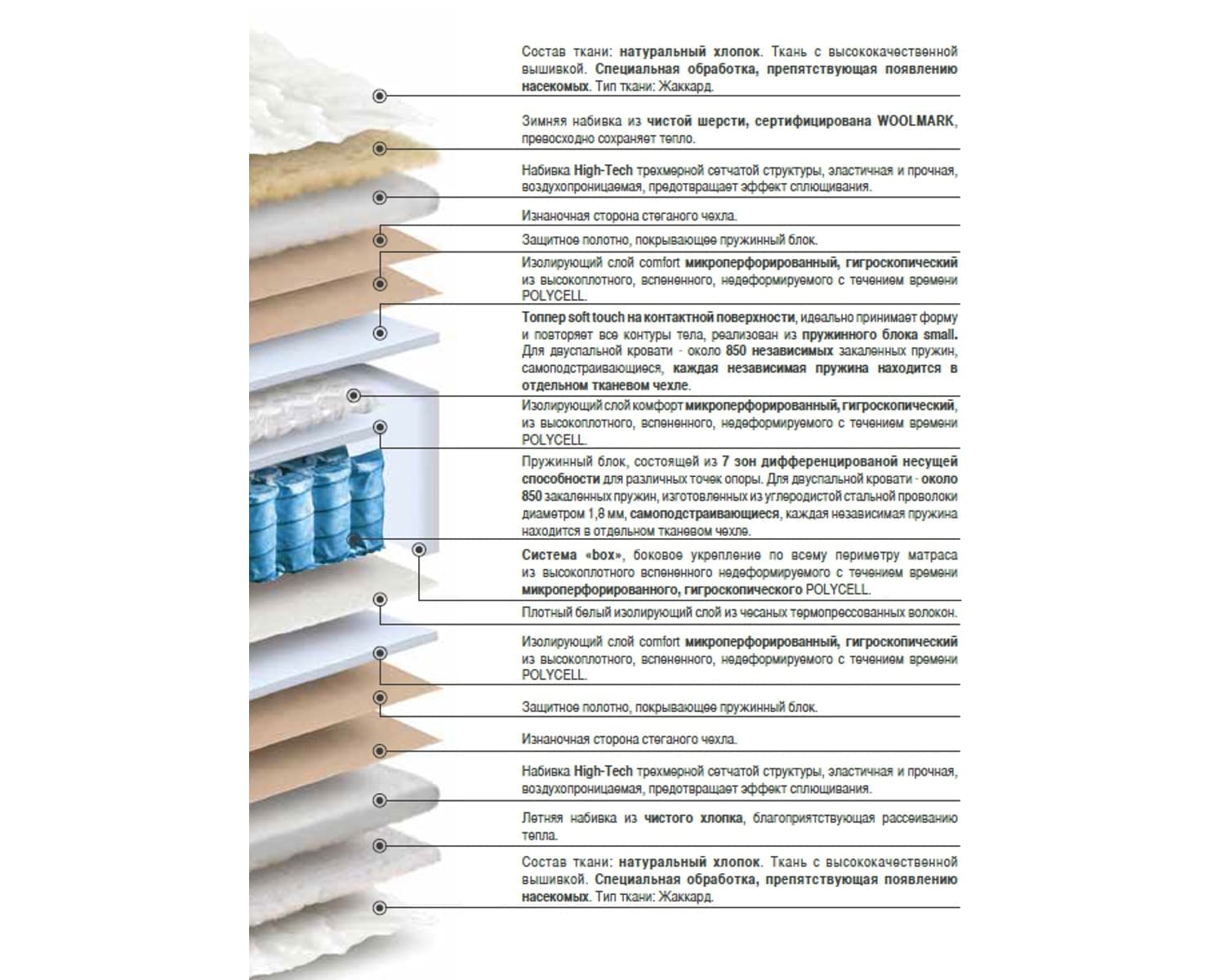 Система «box», боковое укрепление по всему периметру матраса из высокоплотного вспененного недеформируемого с течением времени микроперфорированного, гигроскопического POLYCELL.