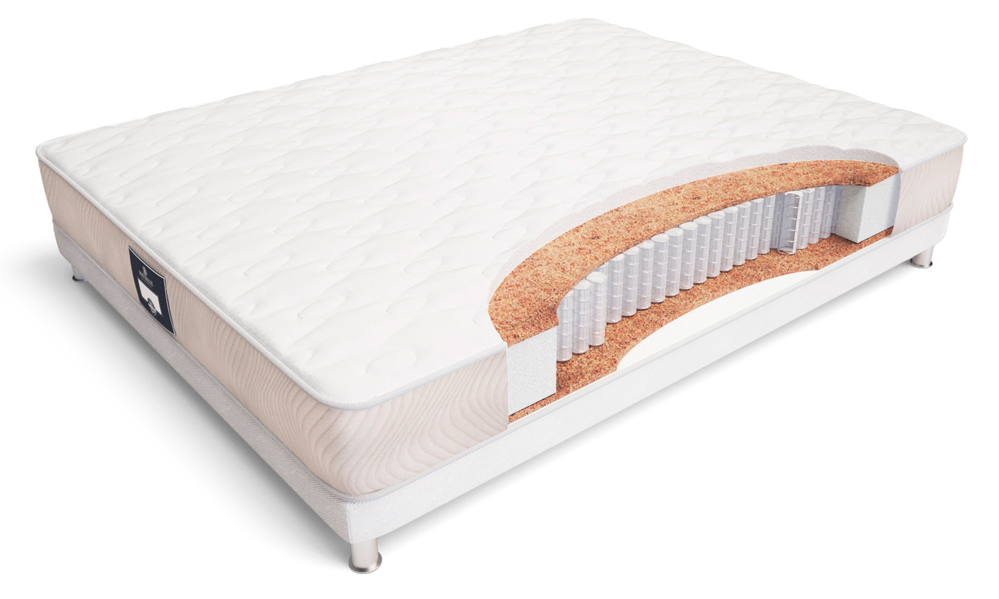 Матрас достаточной жесткости, состоящий из независимого пружинного блока и двух слоев латексированного кокоса по обеим сторонам.